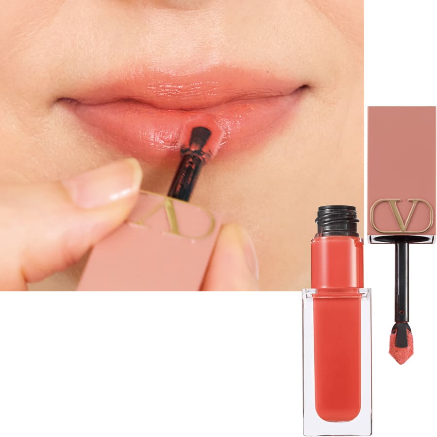 リキッドリップを唇の中央に直塗りして、上下の唇を軽く合わせて馴染ませます。3で使用したブラシで、広げすぎないようにボカシます。リップブラシで塗るよりもさらに柔らかなニュアンスに。肌を美しく引き立てる万能カラーは、リップにもチークにも使えるリキッドタイプ。リキロッソ 409A CORAL SUNSET ¥7,040(ヴァレンティノ ビューティ)