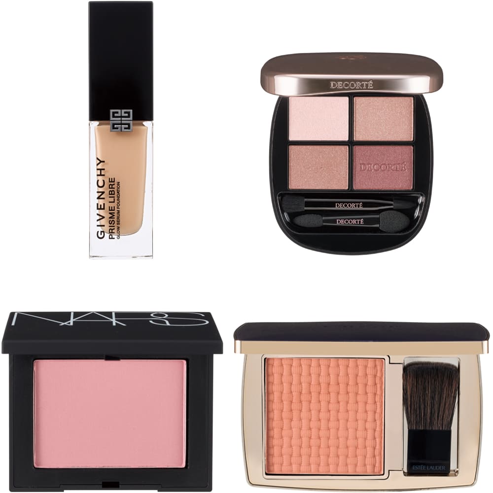 上段左から:素肌そのものが綺麗に見えるような透明感のあるセミツヤ肌に。プリズム・リーブル・グロウ・セラム・ファンデーション 1N 30ml ¥8,030(パルファム ジバンシイ)少しモーヴ感のあるブラウンでフレームを引き締めて華やかな目元を演出。コスメデコルテ スキンシャドウ デザイニング パレット04 Ballerina ¥7,700(コスメデコルテ)下段左から:フェイスパウダーを使わず、パウダーチークの2色使いで肌に柔らかなニュアンスを。甘くなりすぎず、ヘルシーさと上品さを両立する絶妙なピンク。NARS ブラッシュ N 903 ¥5,060(NARS JAPAN)大きめブラシで頰に。残りのチークを広範囲にかけると自然な陰影が生まれてモダンな仕上がりに。ザ スカルプティング ブラッシュ マグネティック グロウ ¥7,700(エスティ ローダー)