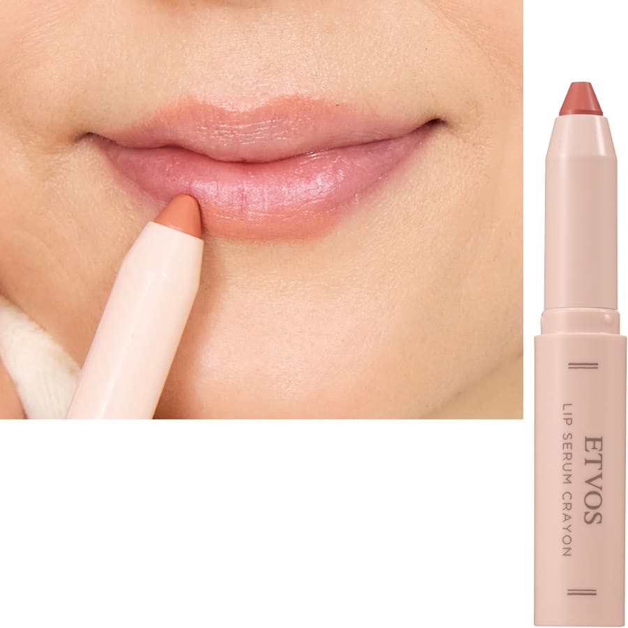 口まわりが痩せてくる大人の唇は、山の部分と下唇の中央を少しオーバー気味に描くのがコツ。塗りやすいクレヨンタイプのオレンジ系でラインを引いたら、指でトントンと軽く馴染ませます。痩せた唇に自然なボリュームが生まれ、人中が短く見える効果も。オーバー気味に塗ることで、唇のふっくら感が際立ってバランスよく整います。塗るたびうるおい、くすみや縦ジワもさりげなくカバーできるセミマット。リップセラムクレヨン オレンジテンポ ¥3,300(エトヴォス)※数量限定