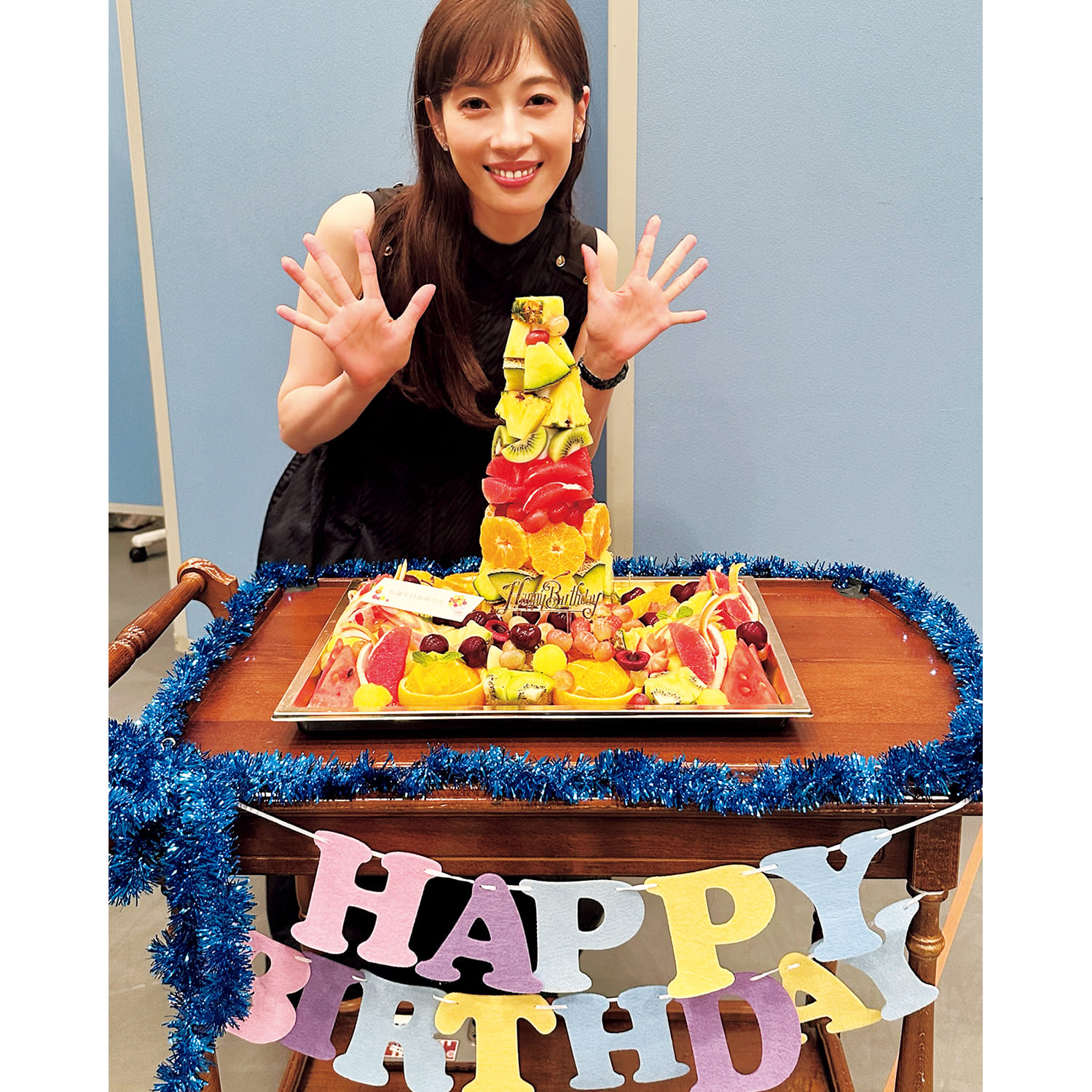 ミュージカル『コレット』のお稽古で、ビタミンたっぷりのフルーツタワーでお祝いしていただきました。当日はファンクラブの生配信も。愛猫・おこげが描かれたおせんべいをいただきました!