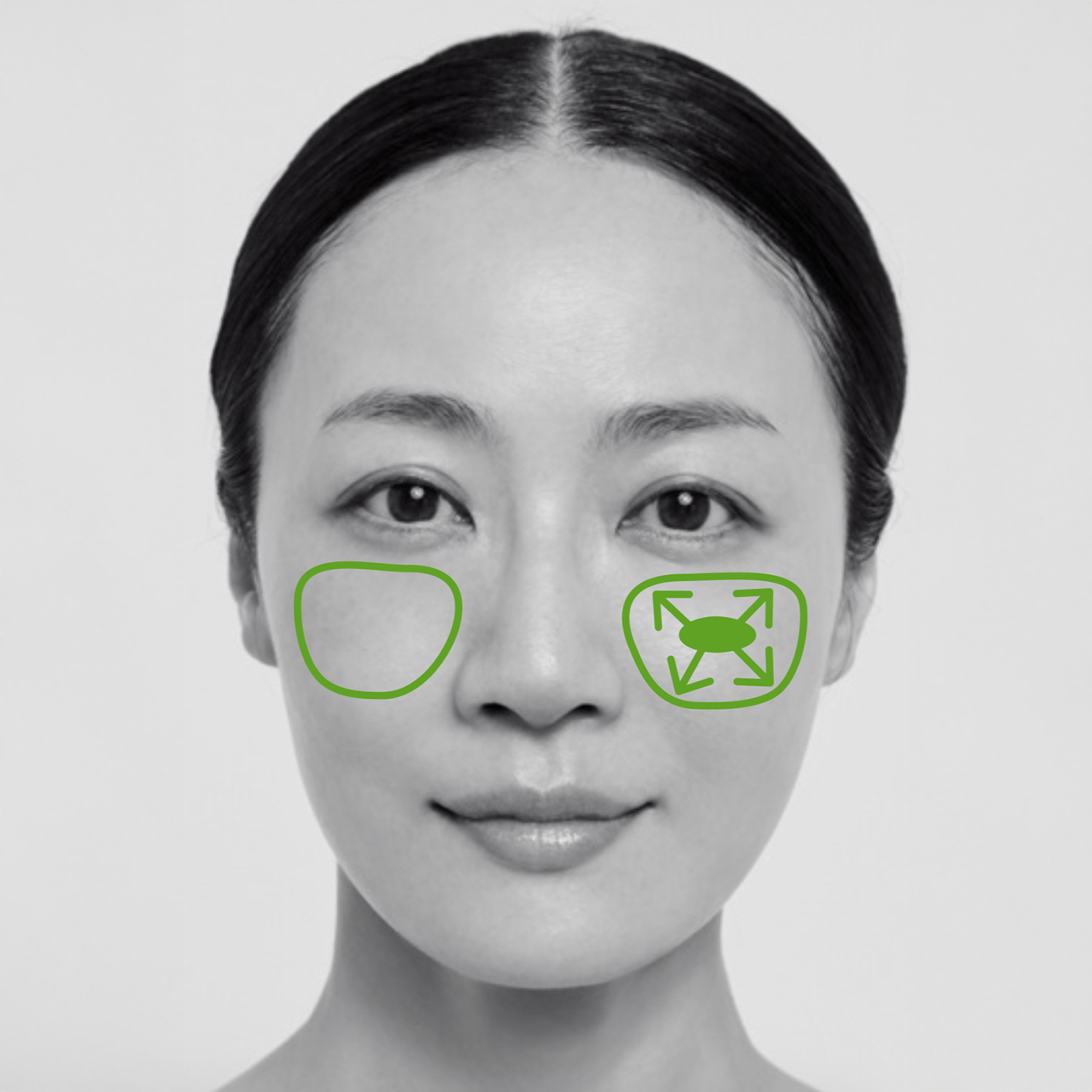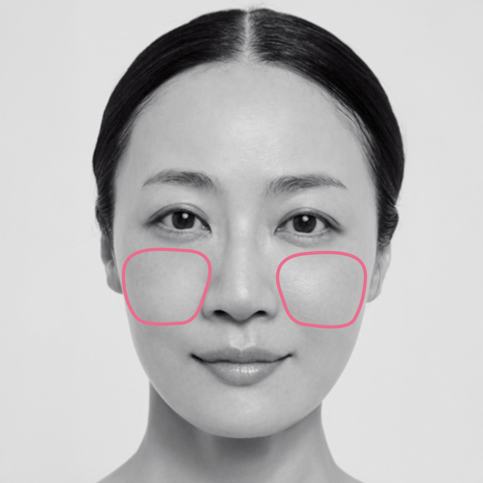 赤みが出やすい頰は緑丸の箇所から指で放射状に広げ、スポンジで馴染ませます。ニキビなどトラブルのある赤みには一回り大きめにのせ、指で伸ばして。