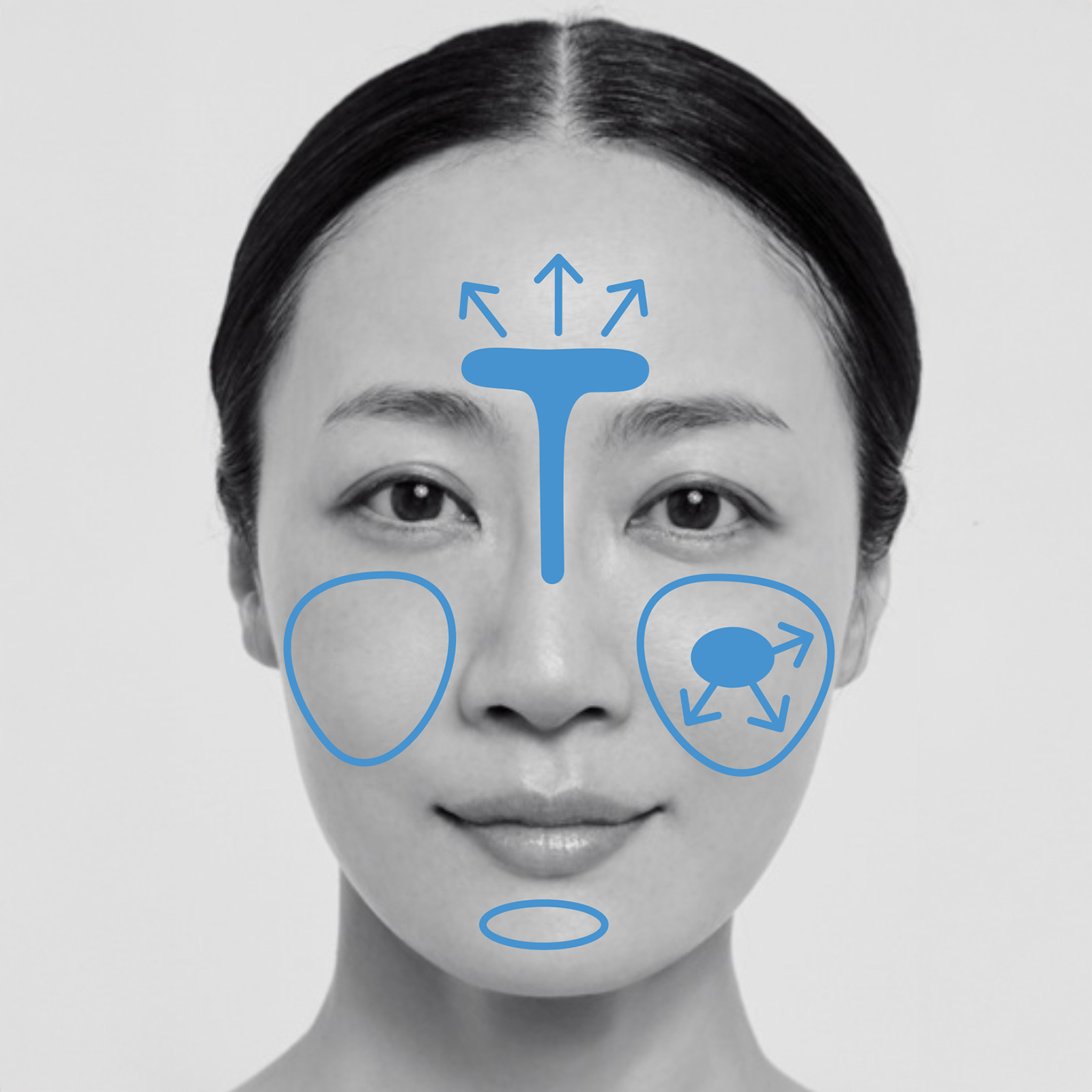 透明感を与えるブルーは白肌さんに。頰の中央(青丸)から放射状に伸ばし、クマ手前まで。Tゾーンは矢印の箇所までで適度なハイライト効果を。