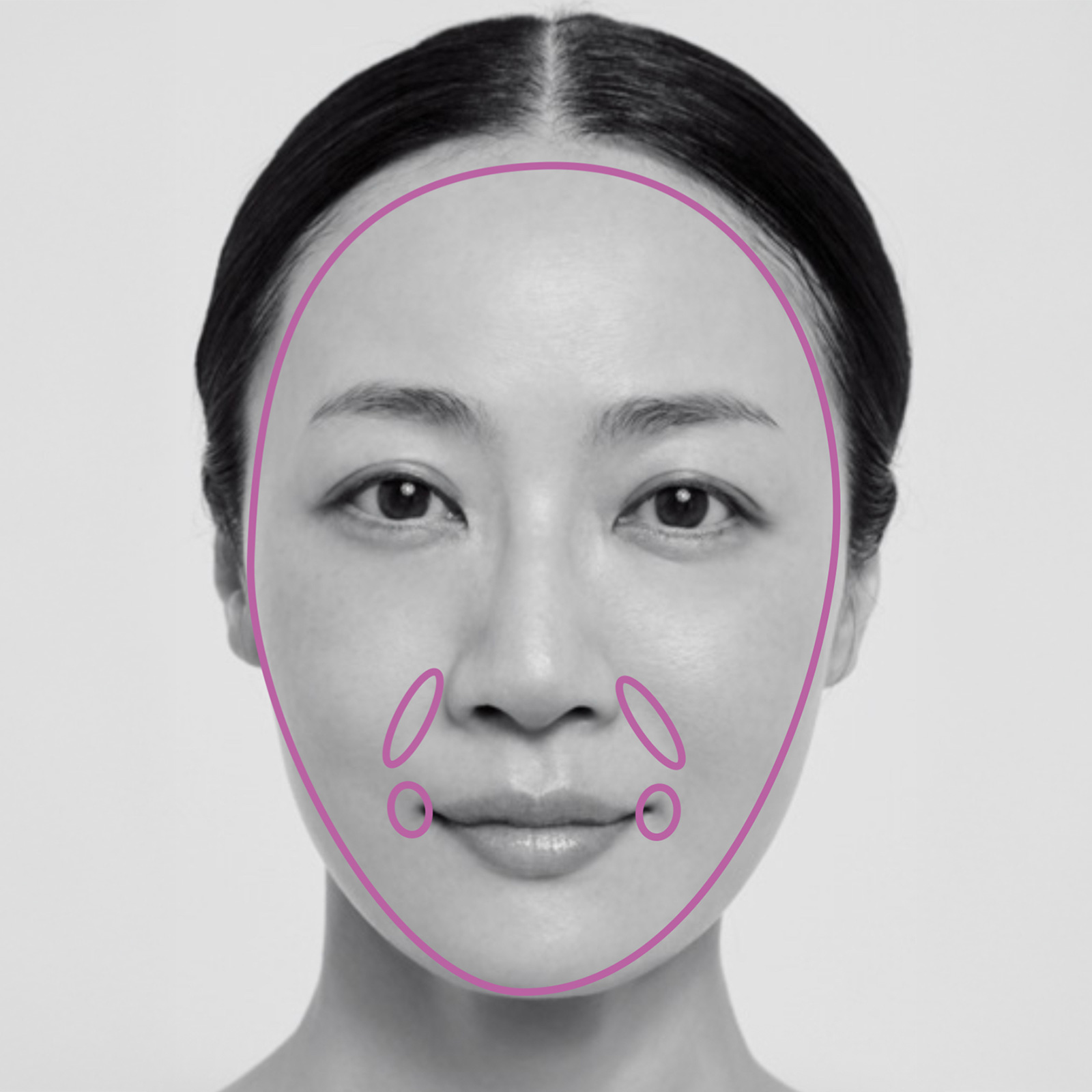 黄みトーンの肌はラベンダーを。フェイスラインの一回り内側まで。内から外へ伸ばすことで自然な立体感を。特に気になる部分には重ねづけします。