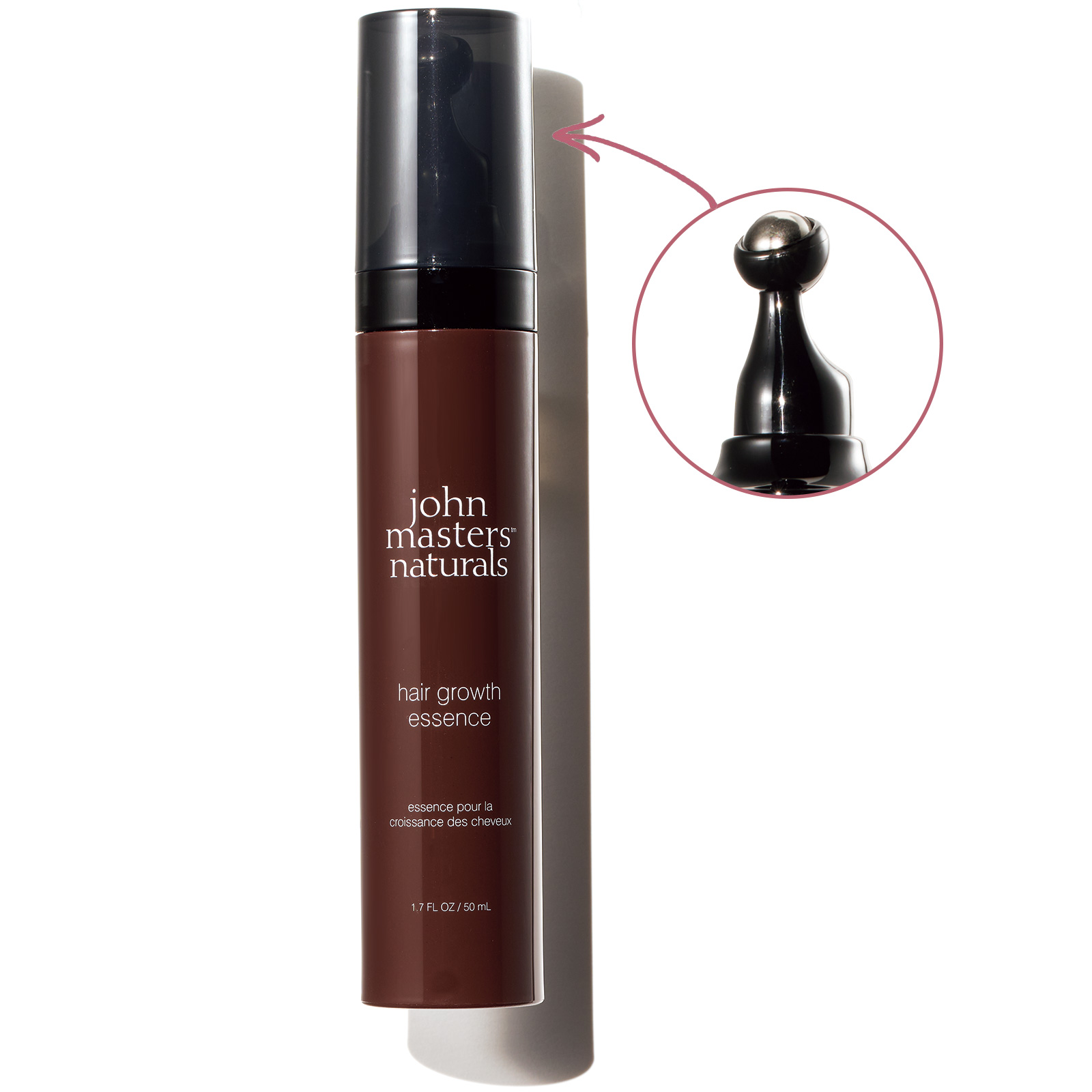 先端のボール部分を頭皮に押し当てるとエッセンスが適量出てくるので、気になる部分に転がしながら馴染ませます。3種の植物由来有効成分が発毛・育毛を促進し、豊富な保湿成分で潤いに満ちたやわらかい頭皮に。薬用 ヘアグロースエッセンス[医薬部外品] 50ml¥5,940(ジョンマスターオーガニック)