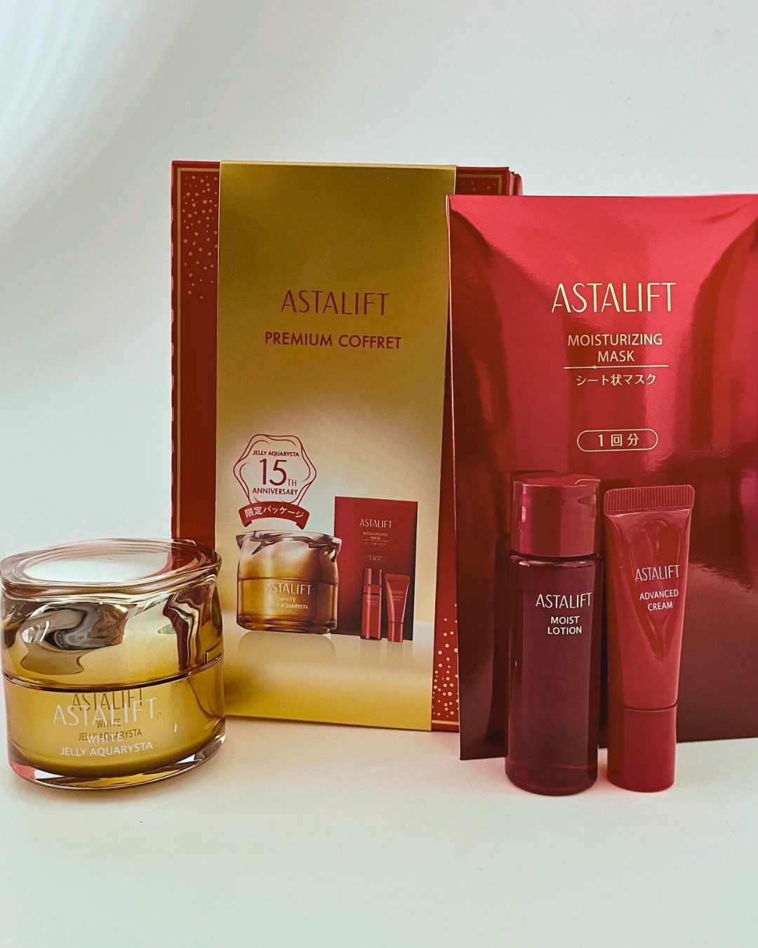 ASTALIFT 15周年記念 。毎年大人気の先行美容液「ホワイト ジェリー アクアリスタ」が、15周年を祝う特別な限定コフレに。お肌の土台を整え、ハリとうるおいを高めてくれる贅沢なセットです。自分へのご褒美にも、大切な人へのギフトにもぴったり。
