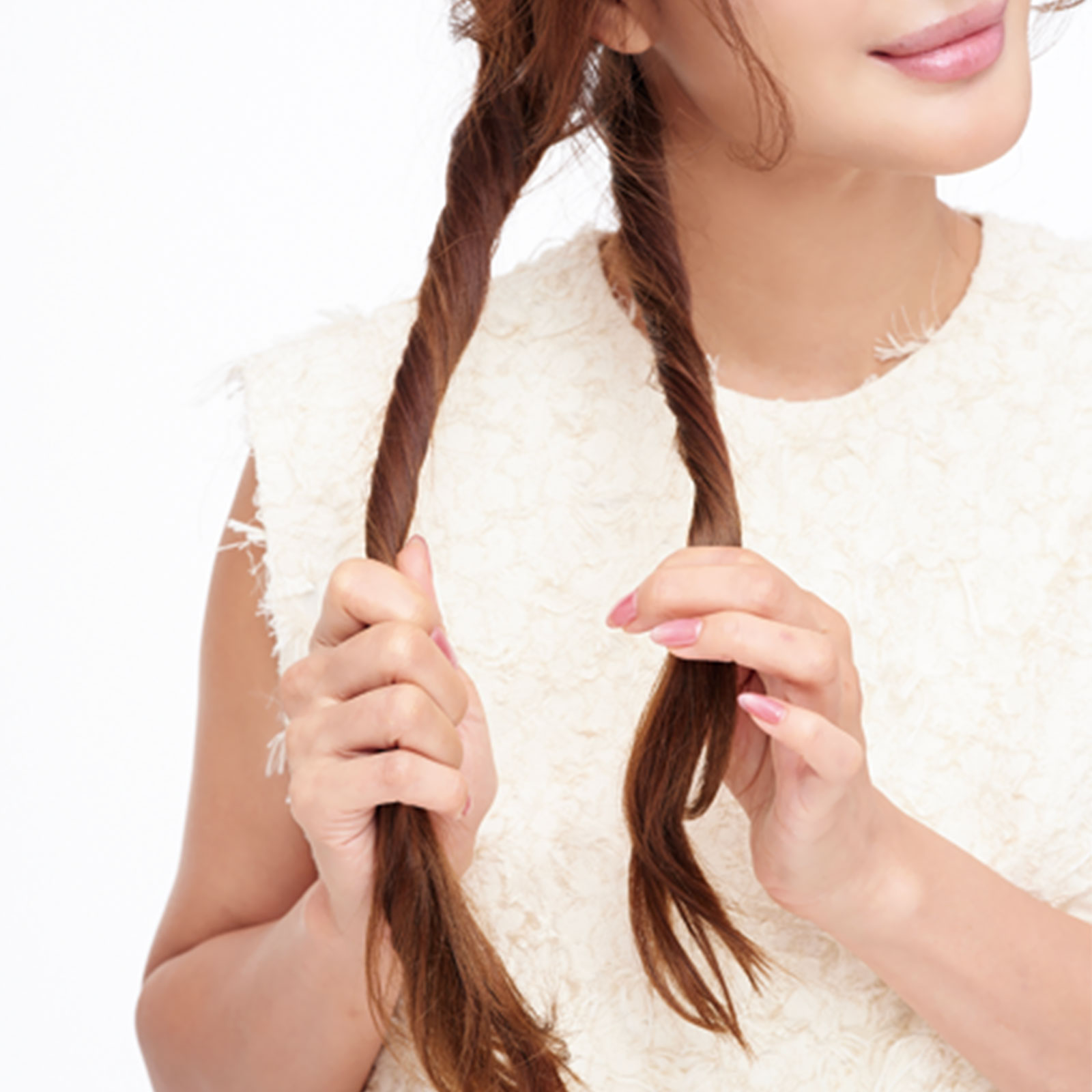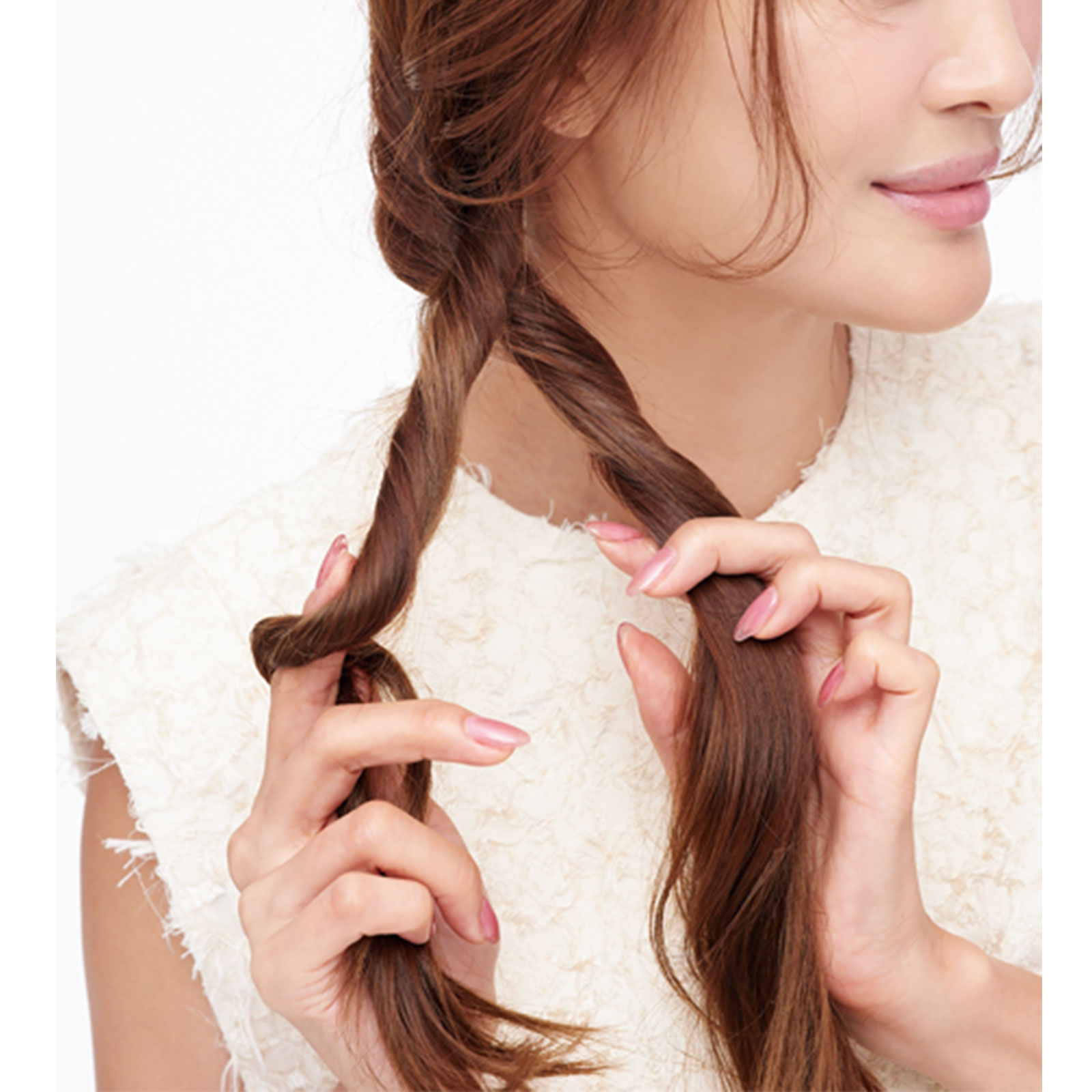 4.毛先をゴムで仮留めし、リボン付きゴムで結び目を隠せば完成。