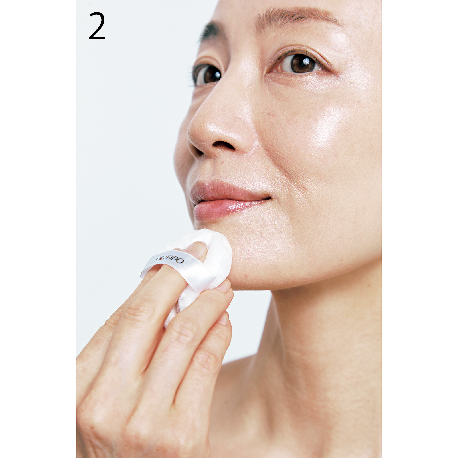 パウダーをのせるのは、Tゾーンから鼻周り、顎先までのテカリが気になる部分を中心に。頰のツヤは残します。肌を優しくなでるようにパフを滑らせ、薄膜に仕上げて。