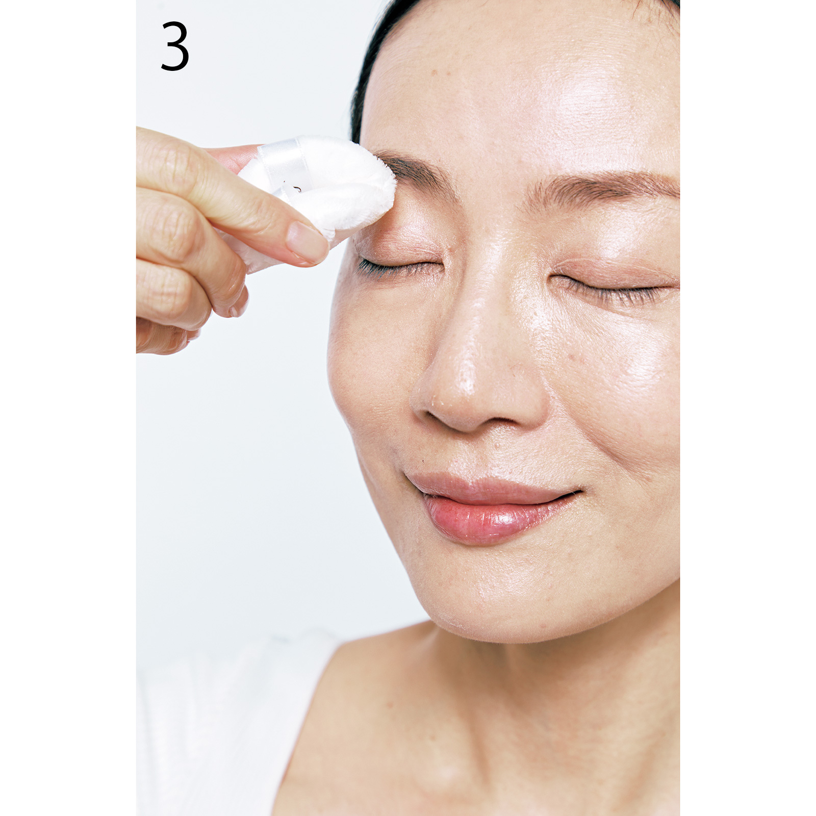 目周りをサラサラに整えると、アイシャドウがキレイに発色。二重ラインや目尻のシワなどのファンデ溜まりが気になるなら、さっと指でならしてから塗布して。