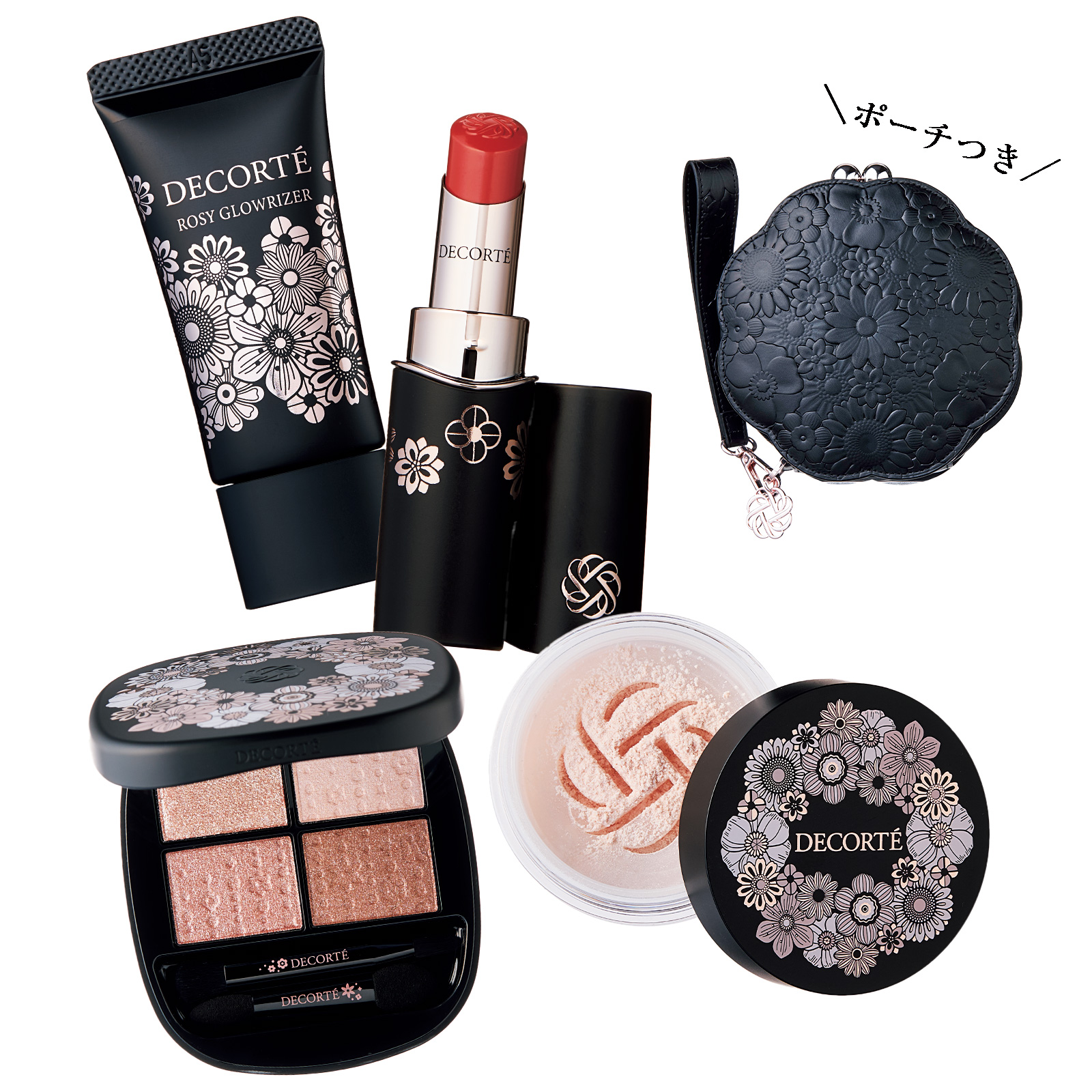華やぐ季節にマッチするきらめきと、顔立ちに溶け込むさりげない発色で上品な仕上がりが叶うメイクコレクション。誰でも使いやすいベージュピンクのアイシャドウ、血色感が続くコーラルレッドのスティックルージュ、肌に透明感を与えるプライマー、繊細パールを含んだフェイスパウダー、オリジナルポーチがセットに。コスメデコルテ エターナル ブルーム コレクション ¥9,350(コスメデコルテ)