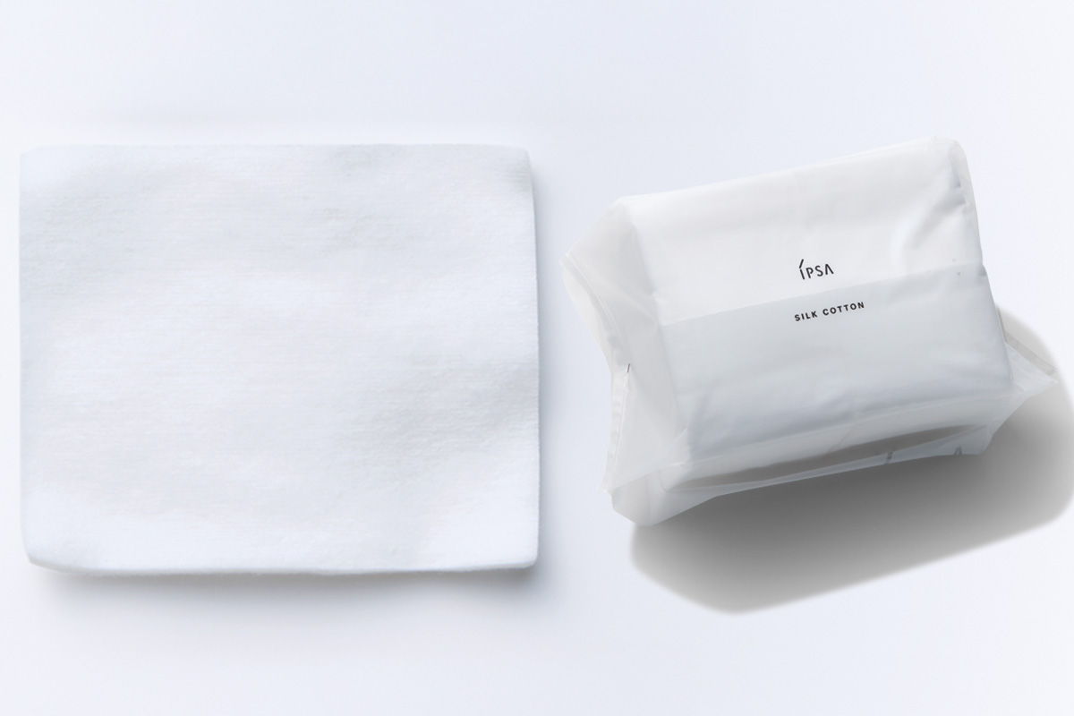 クッション性と放出性のある中太繊維綿を使用し、とろみタイプとの相性もグッド。シルク配合で肌あたりも滑らか。サイズ/6×7.5cm シルクコットン 120枚 ¥550