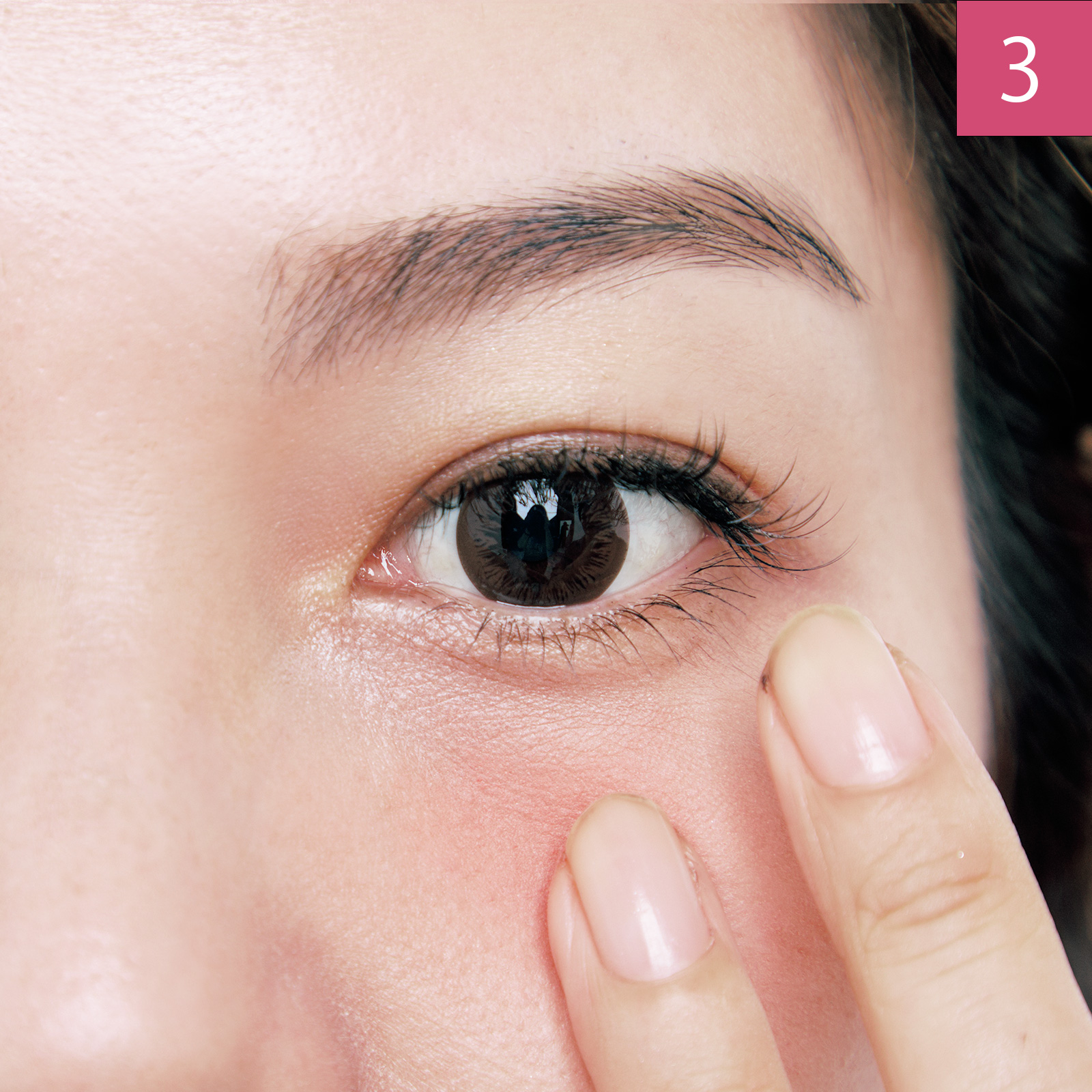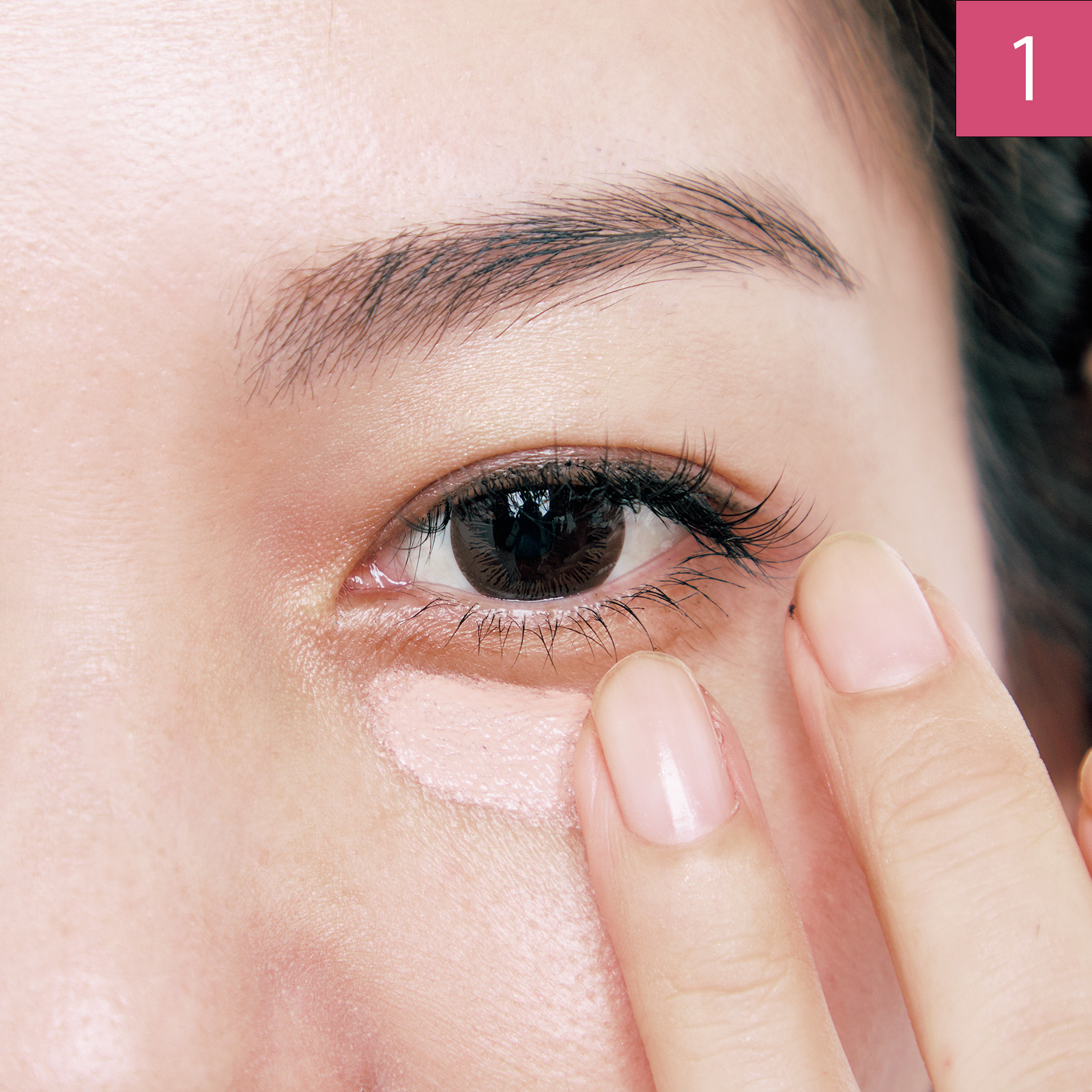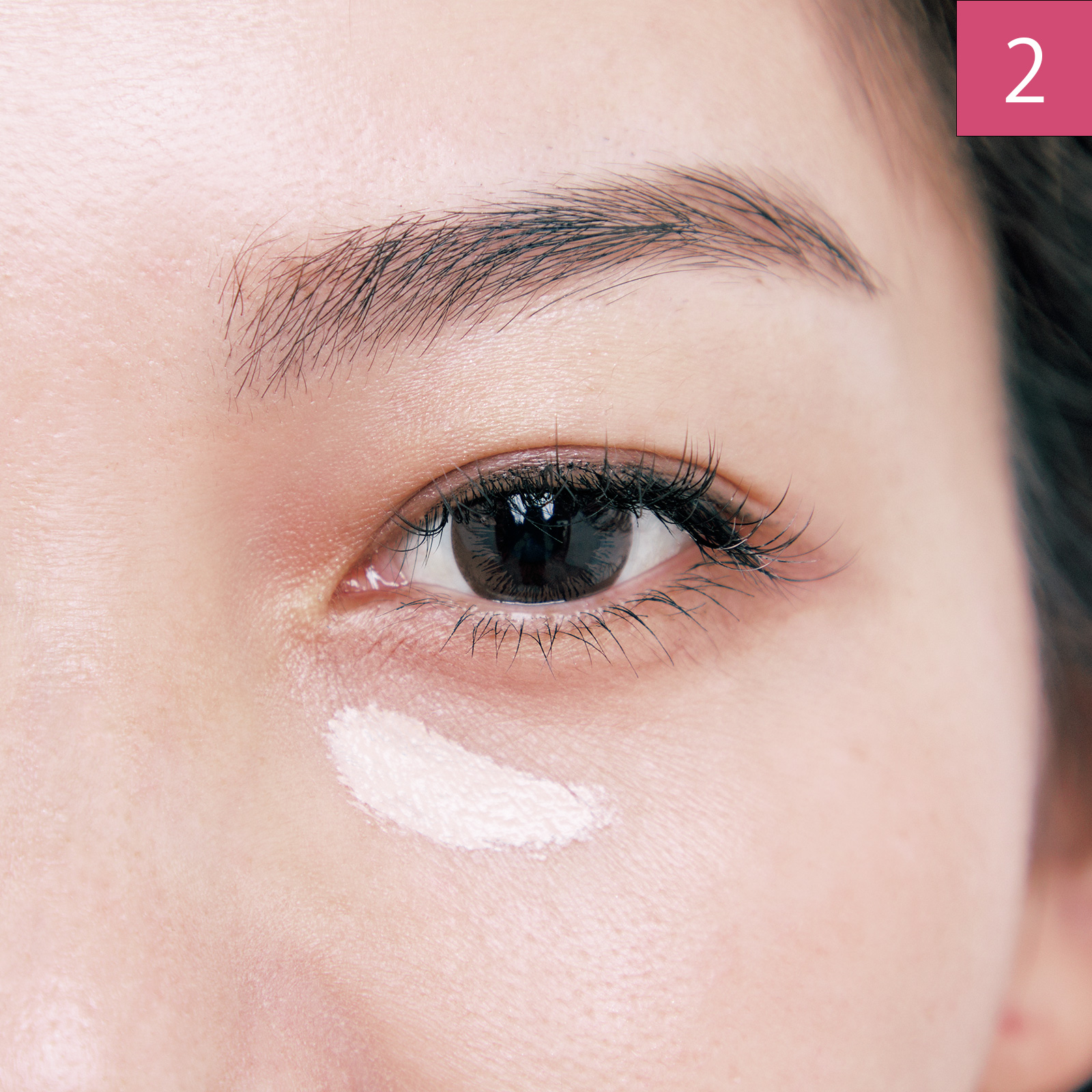 写真中央のピンクコンシーラーを涙袋の下からクマ部分に広げます。薄くのばし広げ、色補整しながらクマをカバー。