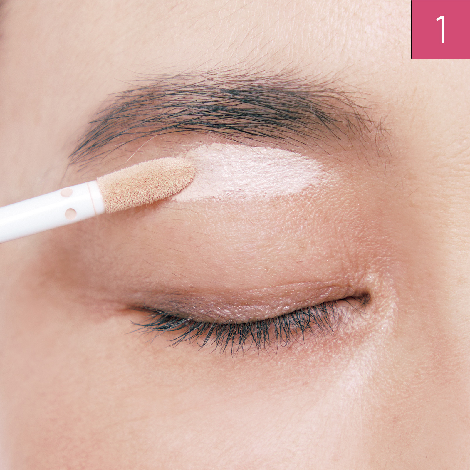 コンシーラーをくぼんだ部分にのせ、アイホール全体にのばします。明るくパンとハリのあるまぶたに。