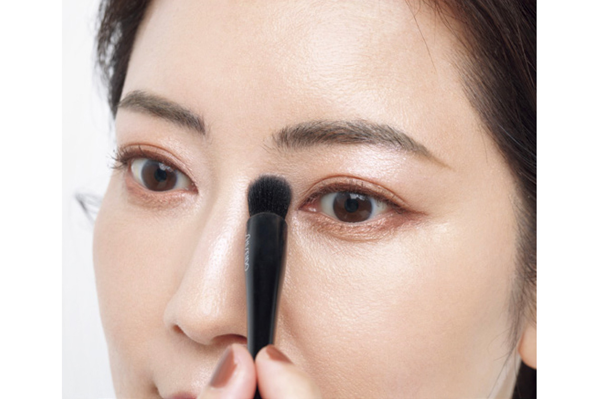 鼻根のサイド、目頭のくぼみは三日月状になるように置くとより効果的。くすみやすく、影が出やすいので忘れずに光をのせて。