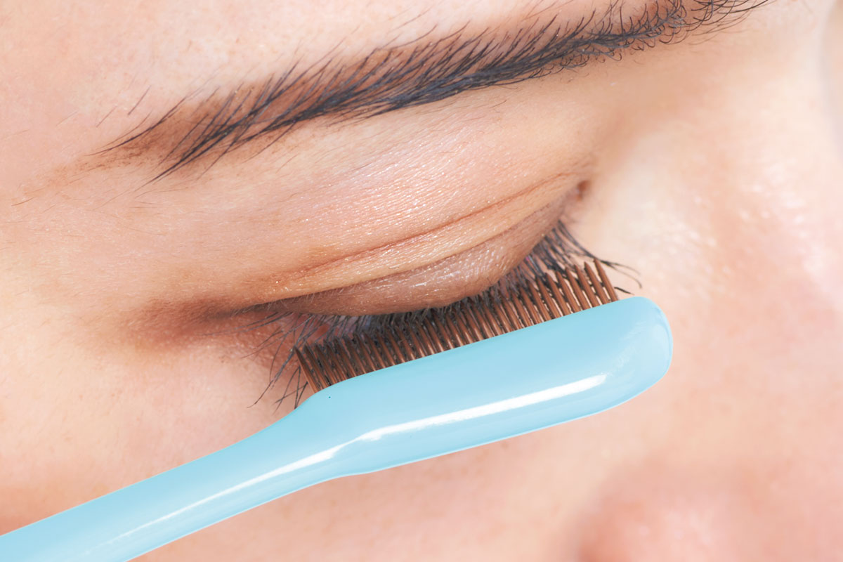 コームで根元から毛先に向かってコーミング。ダマを取り、均一にマスカラ液でまつ毛をコート。扇形に広げ、まつ毛の先まで「目」と錯覚させます。