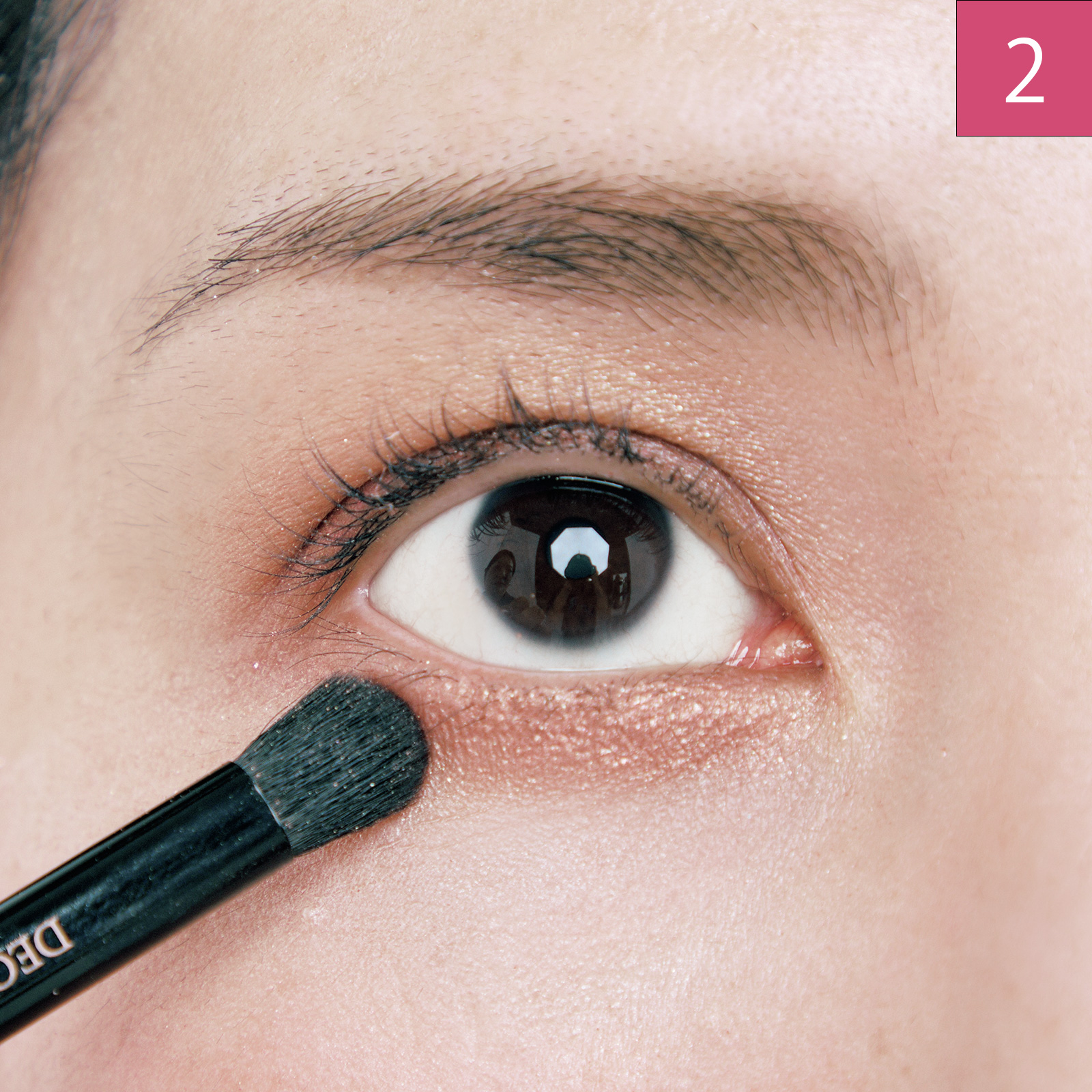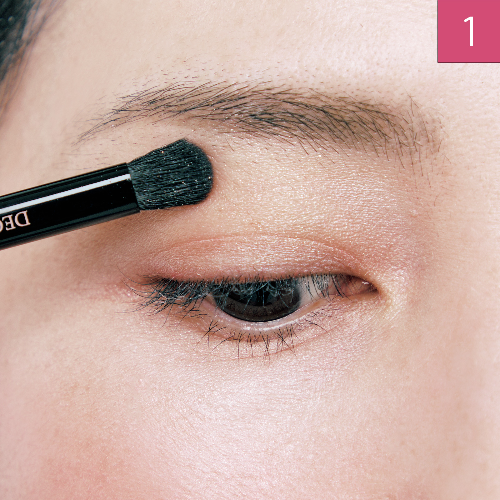 右下の濃いブラウンを黒目の上部分に引く。目のキワのギリギリにラインを引き、マスカラを塗って仕上げる。