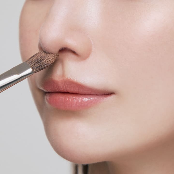 ブロンザーパウダー001の4色を丸筆で混ぜて鼻柱下に5ミリ程度、唇中心部の上と下にもオン。人中短縮効果と、唇をぷっくり見せて求心顔に。