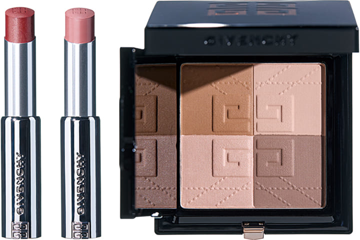 左から:「唇が乾燥しにくいたっぷりな潤い感とケア効果。全体に119、中心に117を塗って、立体感あるぷるんとした唇に」ローズ・パーフェクト・シャイン 117、119 各¥5,060、「細部からフェイスラインまで妥協のないシェーディングが可能。4色を混ぜて顔全体にのせても◎」プリズム・リーブル・ブロンザーパウダー 001 ¥7,480