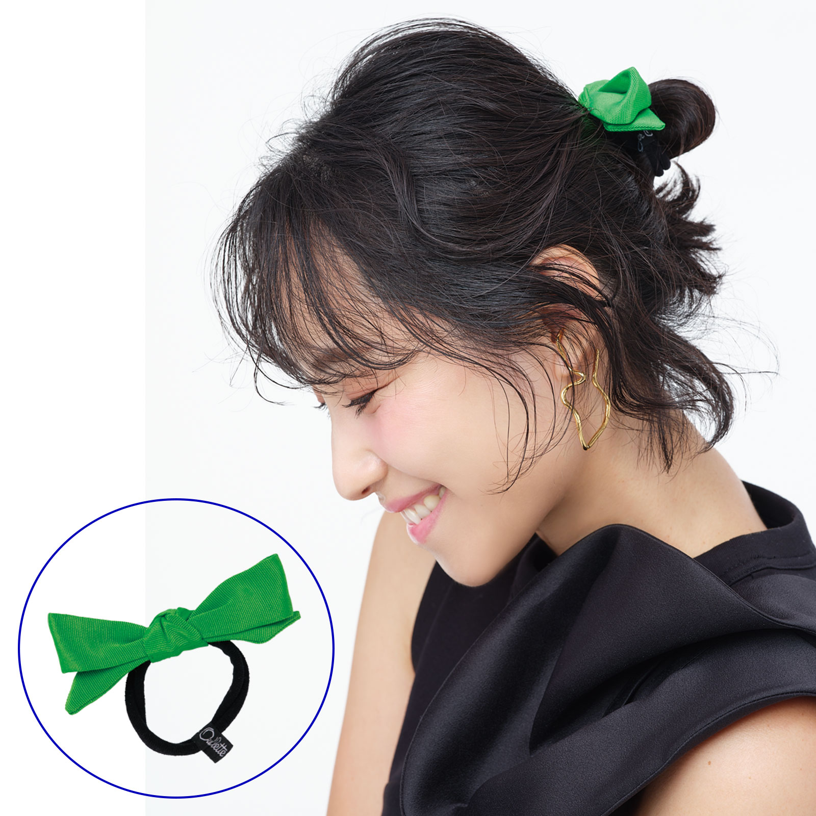 ダークな着こなしが増える秋冬は、横顔や後ろ姿にも映える、グリーンのチビリボンヘアゴムが大活躍。
