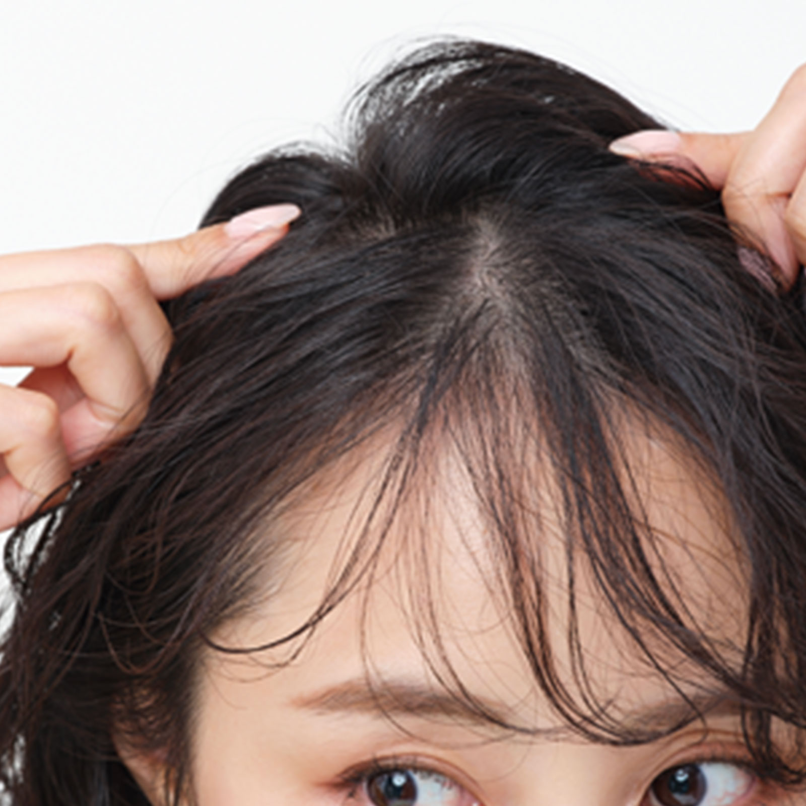 2.カチューシャを頭頂部やや手前にセット。後頭部まわりの毛を引き出しふんわり感を。