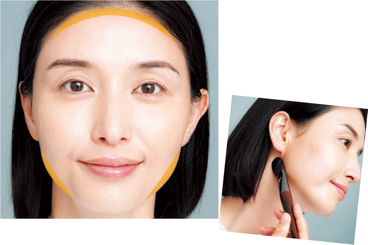 マット質感のフェイスパウダーで不要なツヤを抑えると、陰影が際立ち小顔見え。毛穴もフラットに。顔周りは半顔ずつ下から上に、その後つけ直さずに額→頰→目周りの順に塗布。右図の通り徐々に薄くなるように塗って。