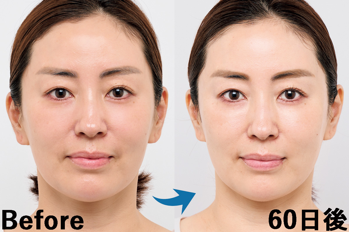 顔全体のむくみが取れて、顎から耳までのフェイスラインがスッキリ。頰のもたつきも減り、法令線が薄くなりました。また血行改善し、赤みや色ムラもなくなって肌トーンが均一に。目力もアップ!(効果には個人差があります)