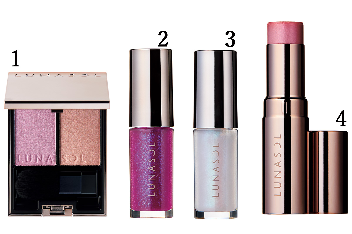 ウォームトーンでまとめた8色アイパレットのほか、まばゆい光を宿す限定品が続々。多彩な色と質感を楽しんで。1 ルナソル カラーリンググレイズ EX11 ¥6,820、2.3 ルナソル イルミネイティングリップオイル EX03、EX01 各¥3,520、4 ルナソル ラディアントスティックN EX01 ¥4,950(すべてカネボウ化粧品)
