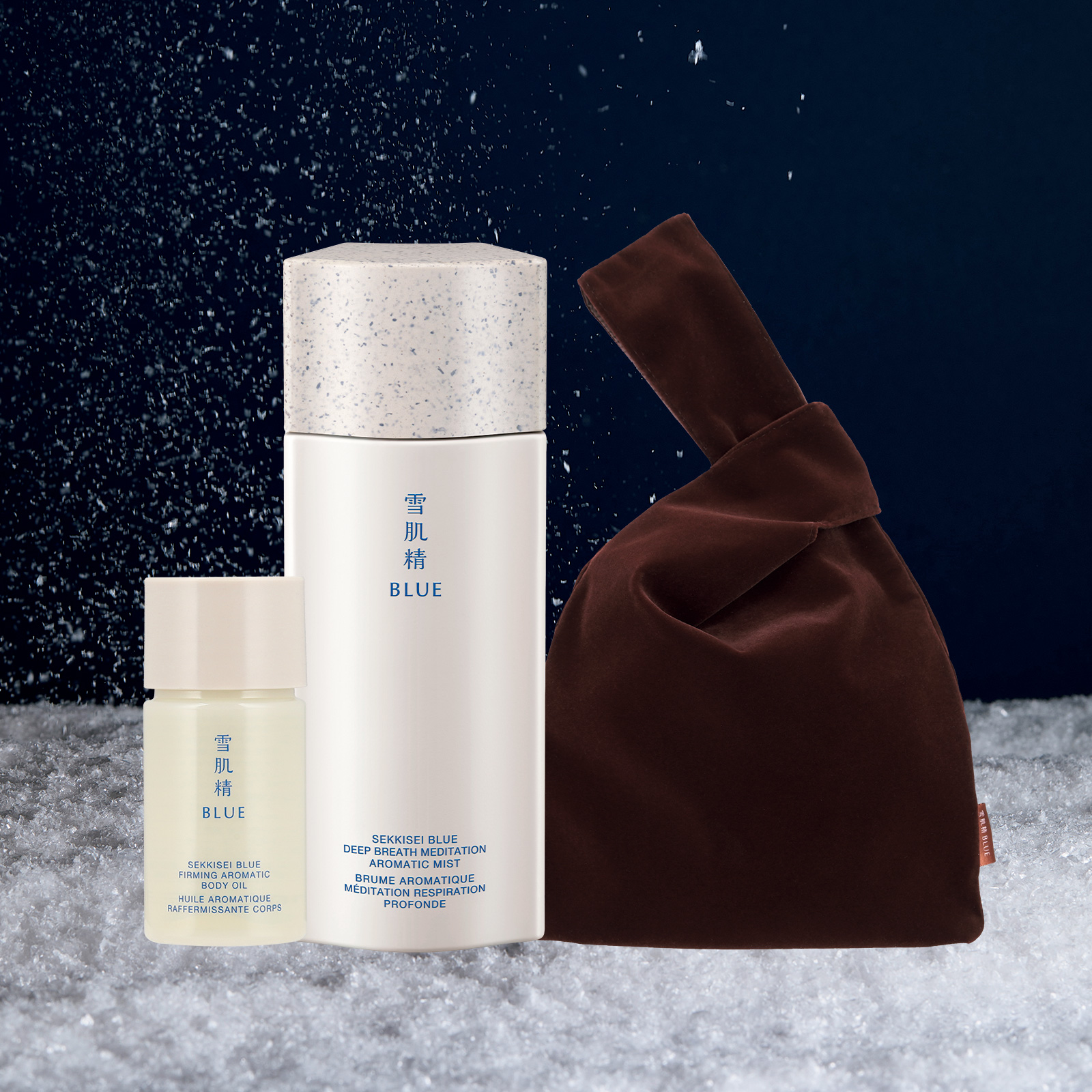 「雪肌精 BLUE ディープブレス メディテーション アロマ ミスト」の現品に「同 ファーミング アロマ ボディ オイル」のミニサイズとオリジナルバッグがセットされたキット。ミストはどんなシーンでも心地よく使える、スパイシーハーバルウッディの香り。和漢植物を配合したオイルはふっくらハリ肌に。雪肌精 BLUE ディープブレス メディテーション アロマ ミスト リミテッドキット ¥5,500〈編集部調べ〉(コーセー)