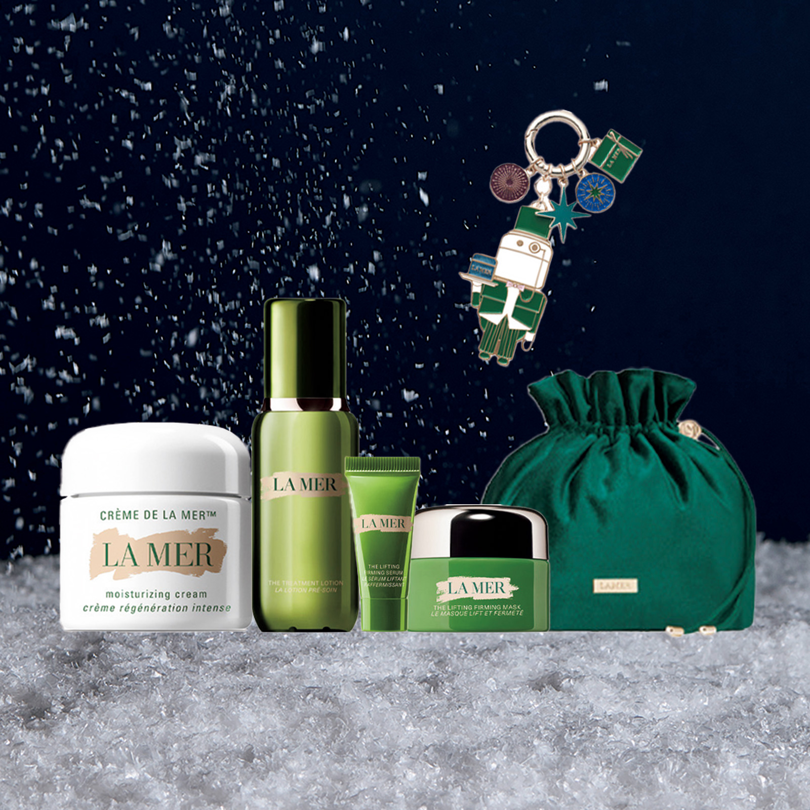 LA MERのアイコン的クリーム「クレーム ドゥ・ラ・メール」などのモイスチャライザーと、高機能化粧水の現品を1つずつ選ぶと、美容液とマスクのトライアルサイズがついてくる、名品を堪能できるプレミアムなコレクション。さらに巾着やチャームもセット。一年頑張った自分へのご褒美に最適のアイテム。ザ・ハイドレーティング ホリデー コレクション ¥81,400〜(ラ・メール)