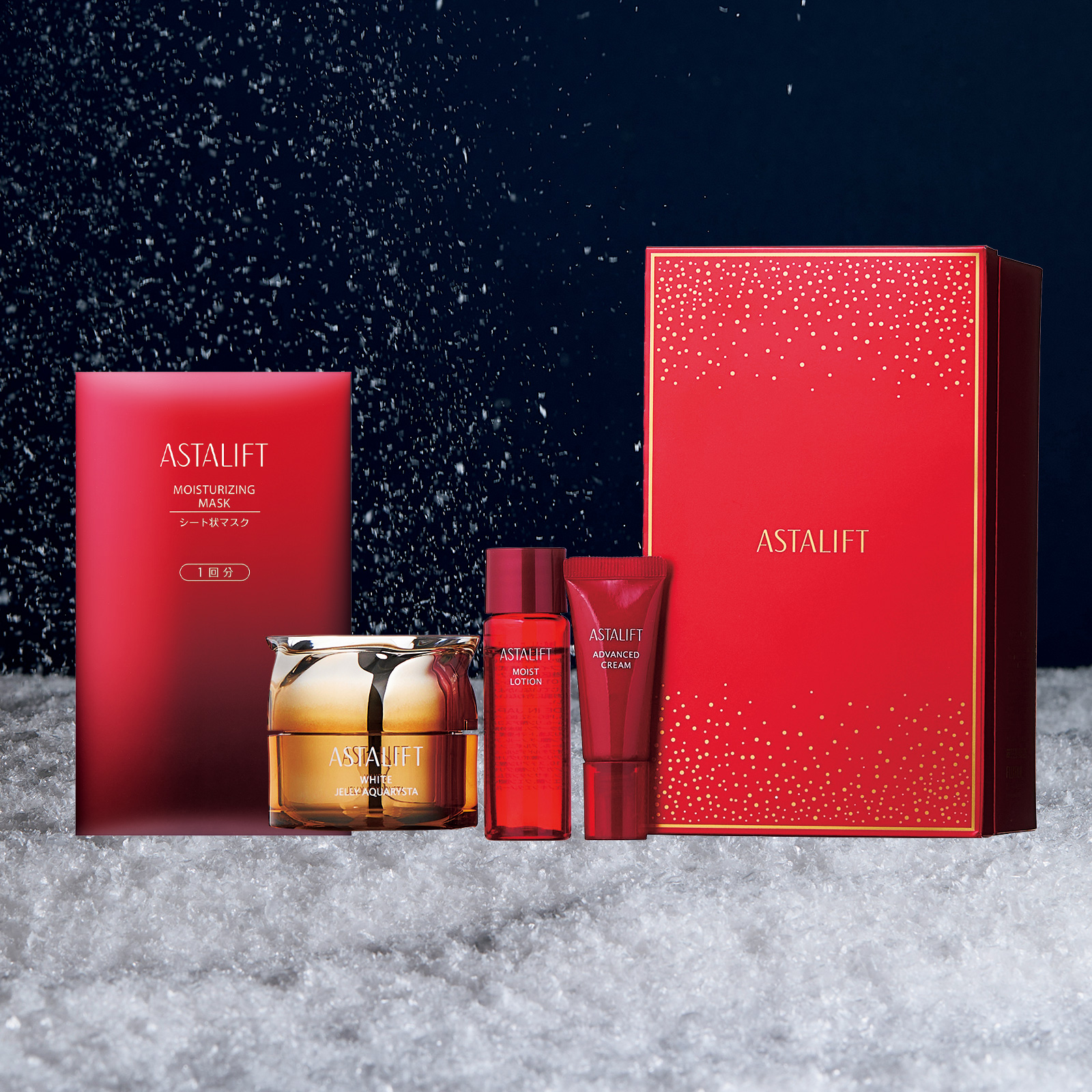 富士フイルム独自のサイエンスから誕生したエイジングケアブランド「アスタリフト」。スターアイテムの「ジェリー アクアリスタ」の誕生15周年を記念し「美の輝き」をテーマにしたゴールドの限定パッケージが登場。化粧水、クリームのミニサイズ、シートマスクをセットにしたプレミアムなコフレは早い者勝ち。アスタリフト ホワイト ジェリー 15th プレミアムコフレ ¥14,300(富士フイルム)