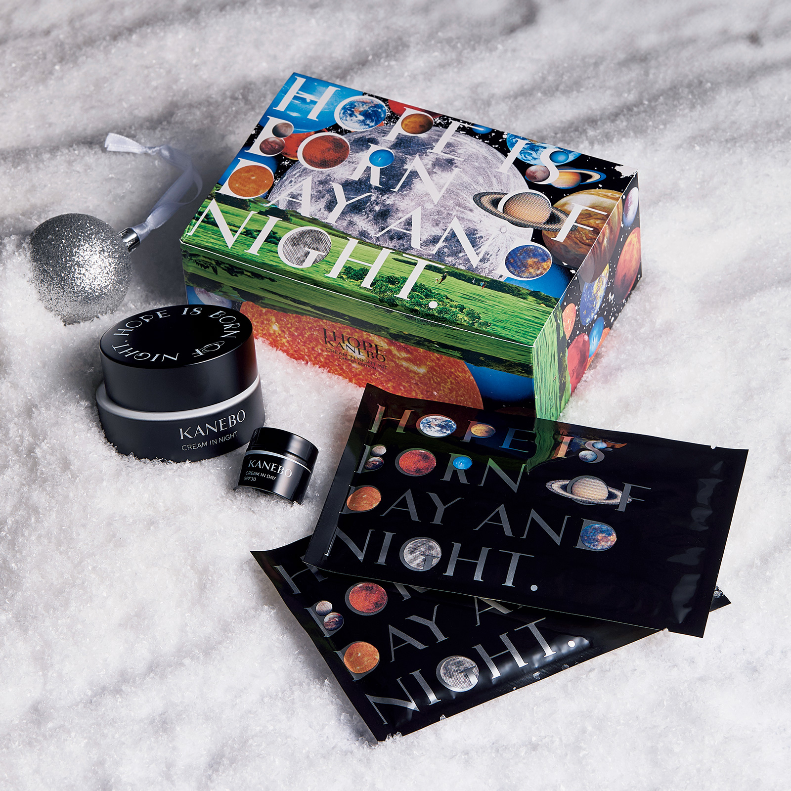 乾燥から肌を守る「胎脂」の力に着想を得た人気の夜クリーム現品に、肌を引き上げながらピタッと密着するシートマスク2枚とメイクのりを高めるデイクリームのミニサイズがイン。セット使いでもっちりハリ肌に! グラフィックアーティスト伊藤桂司氏とコラボしたボックスにも注目。カネボウ クリーム イン ナイトⅡ キット リミテッド エディション ¥13,750(カネボウインターナショナルDiv.)