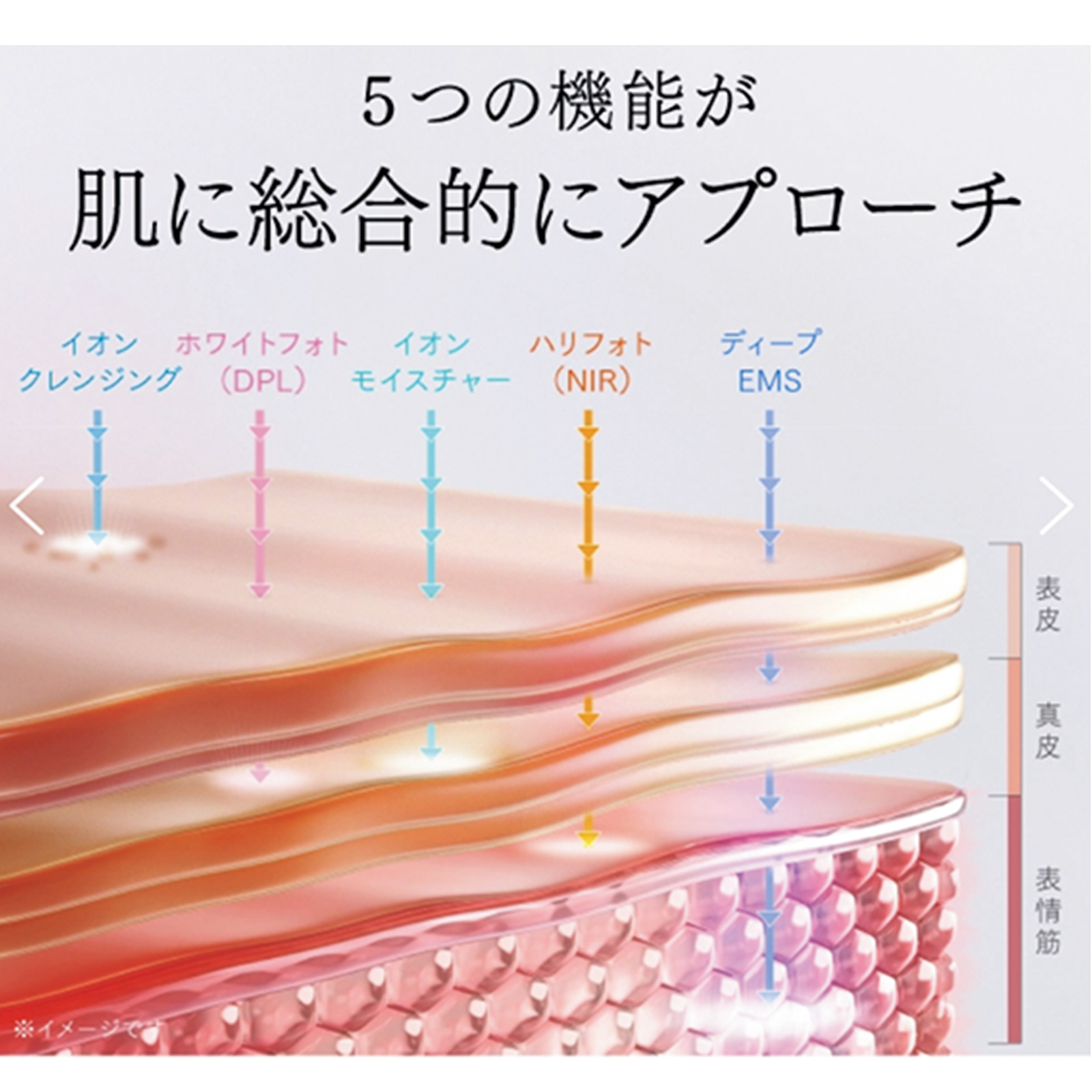 角質くすみや赤みをケアするホワイトフォト、ハリや弾力を保つハリフォトに加え、独自の電気パルスで普段使わない表情筋をしっかり収縮させるEMS、美容成分を角質層まで届けるイオン導入や古い角質や毛穴の奥の汚れを除去するイオン導出等5つの機能を搭載。1台でクリニック級の美肌&リフトケアを可能に。▶詳細はこちら(ブランドサイト)