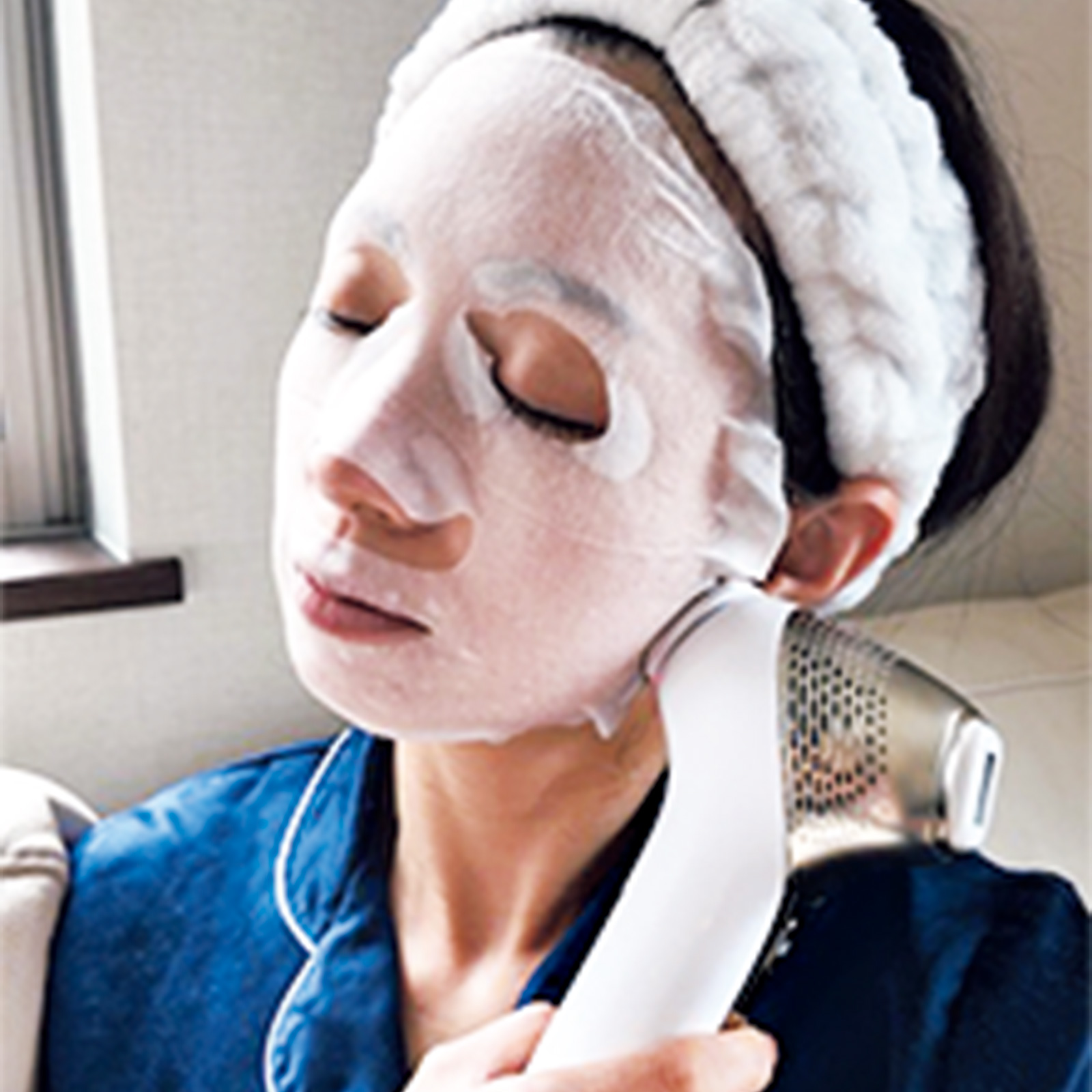 「角質ケアするイオン導出を1日おき、イオン導入や2種類のフォトケアを交互に毎日。お風呂上がりにはシートマスクをしてケアすると潤う極上肌に」(筧さん)