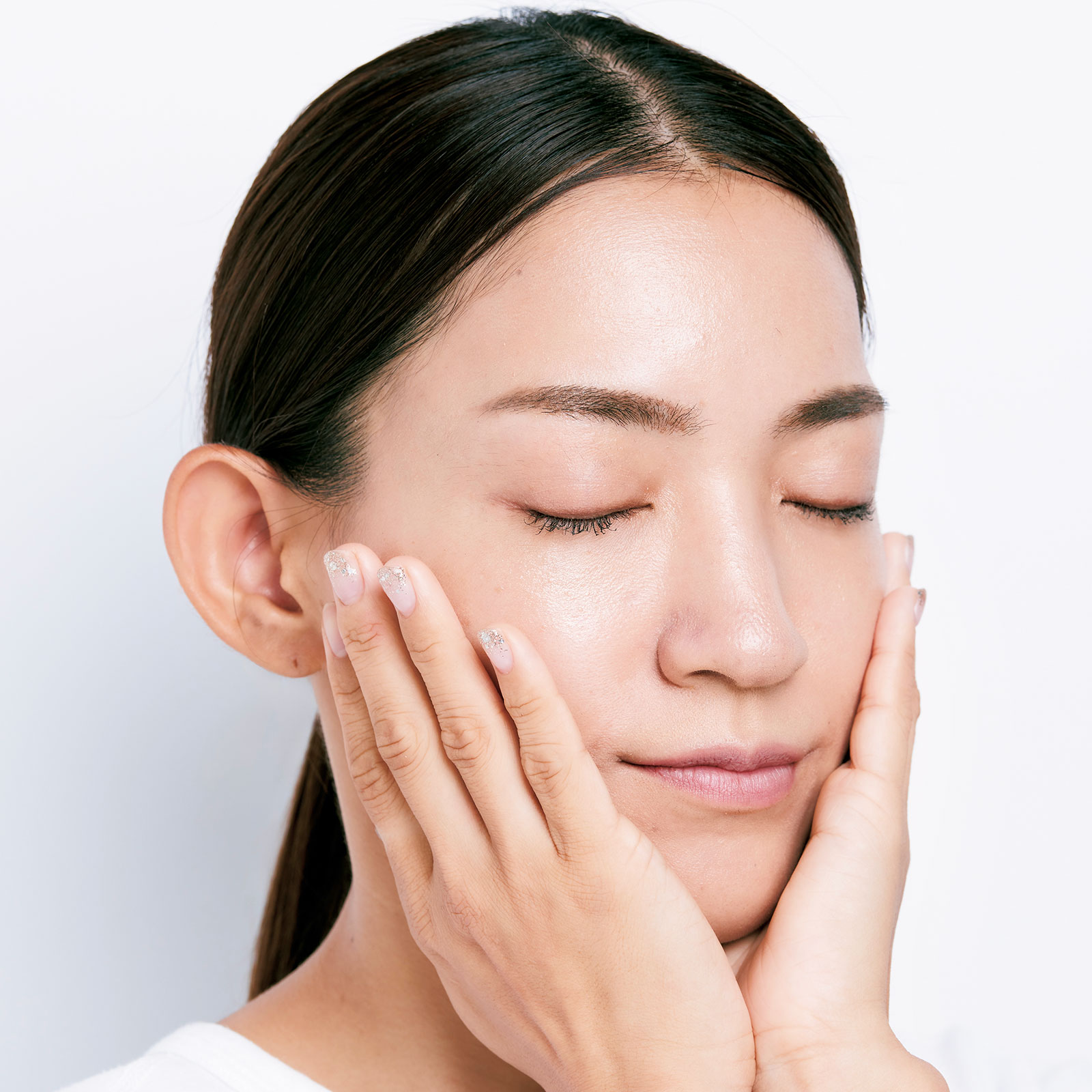 付属の専用スパチュラ、または指先にパール粒1個分を取ります。顔全体に丁寧になじませます。首筋にもしっかり伸ばして。