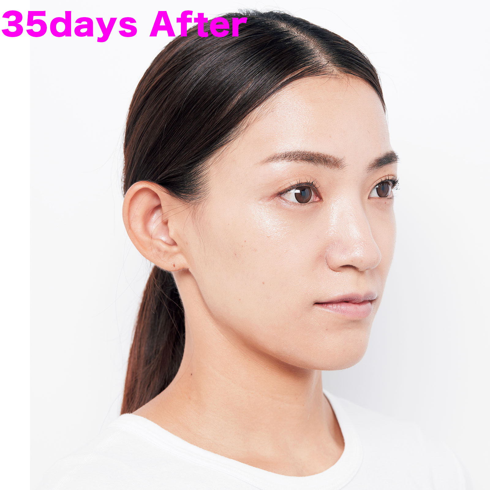あご下のゆるみがみるみる改善。2週間でフェイスラインがくっきり。35日後は頰も高さがアップしてツヤツヤに。元々たるんでなくても、キュッと一回り小顔になった印象。