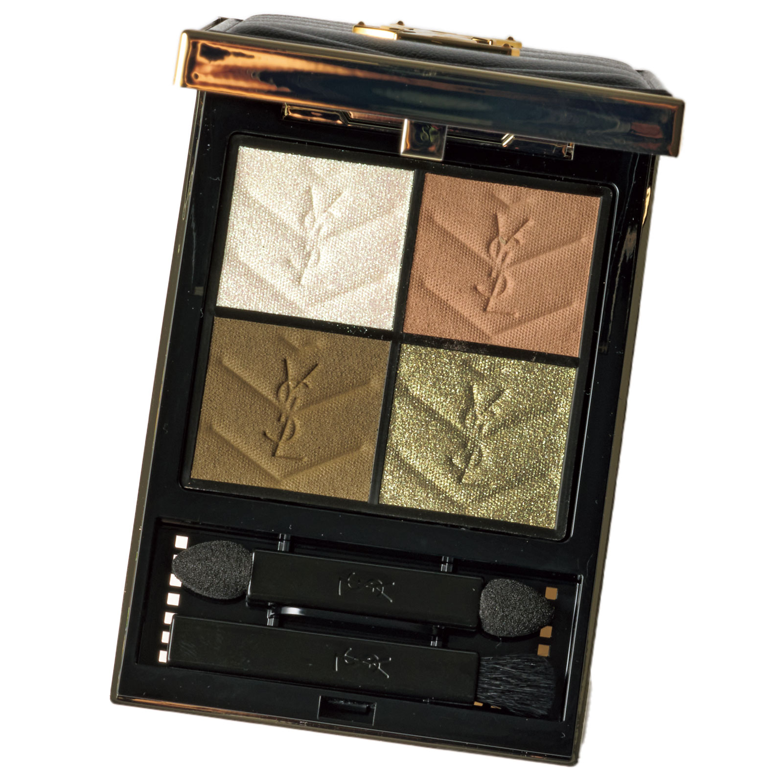 3.左下のディープカーキで目頭から目尻まで、目のキワにラインを引く。左上のホワイトラメを目頭にさりげなくのせたら完成。