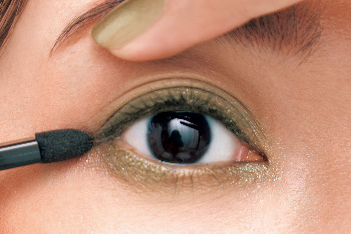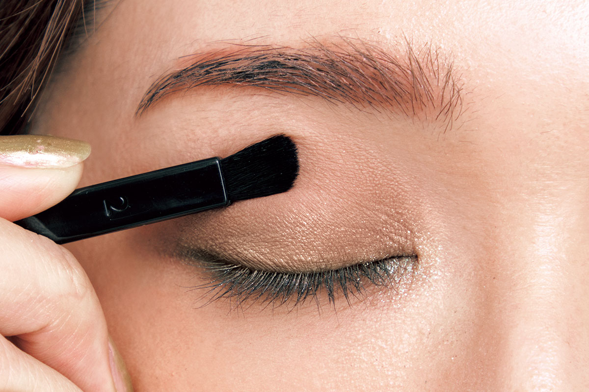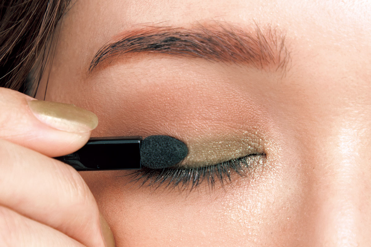 2.右下のラメ入りオリーブを、チップで二重まぶたに入れる。ぼかさずしっかり色味がわかるようにのせて。