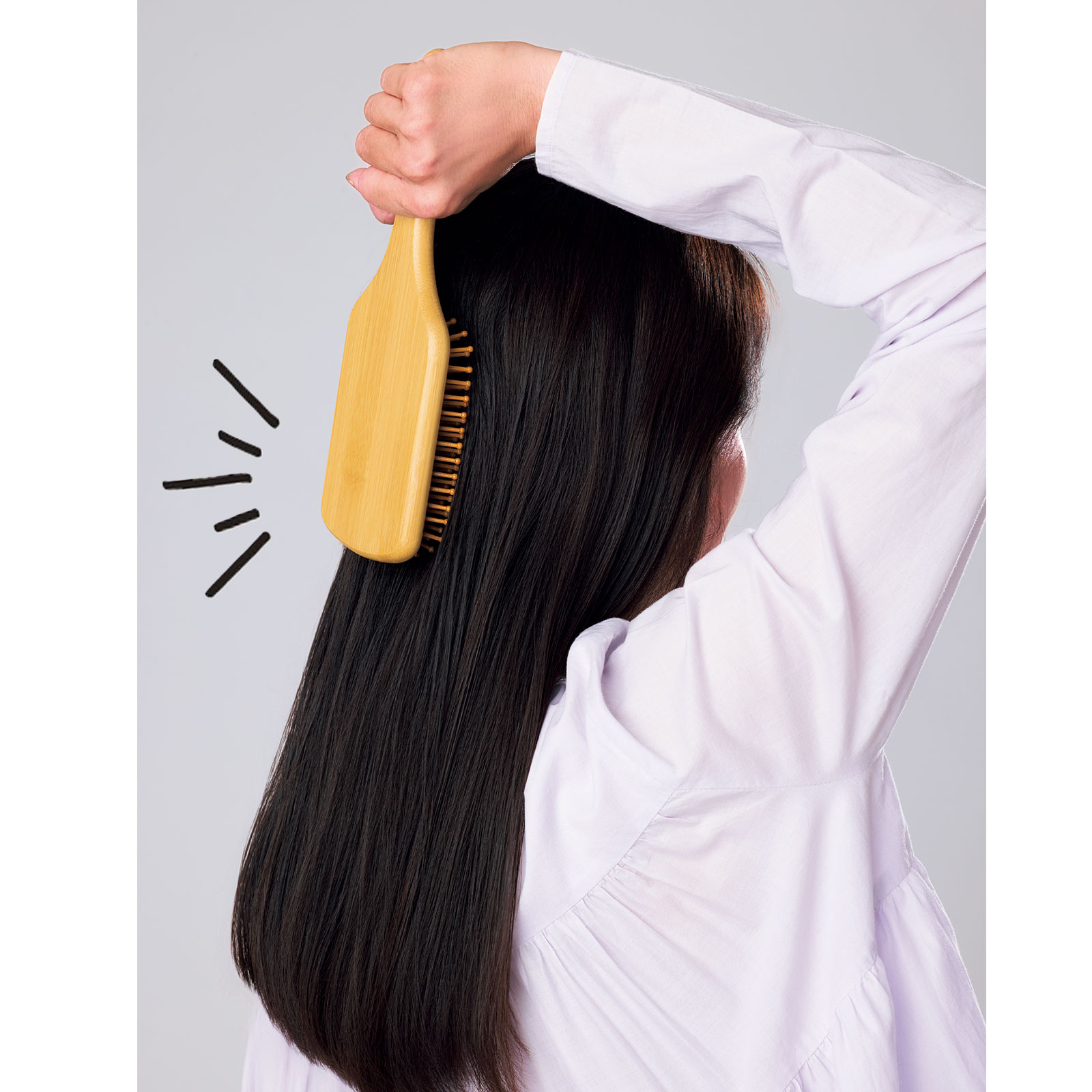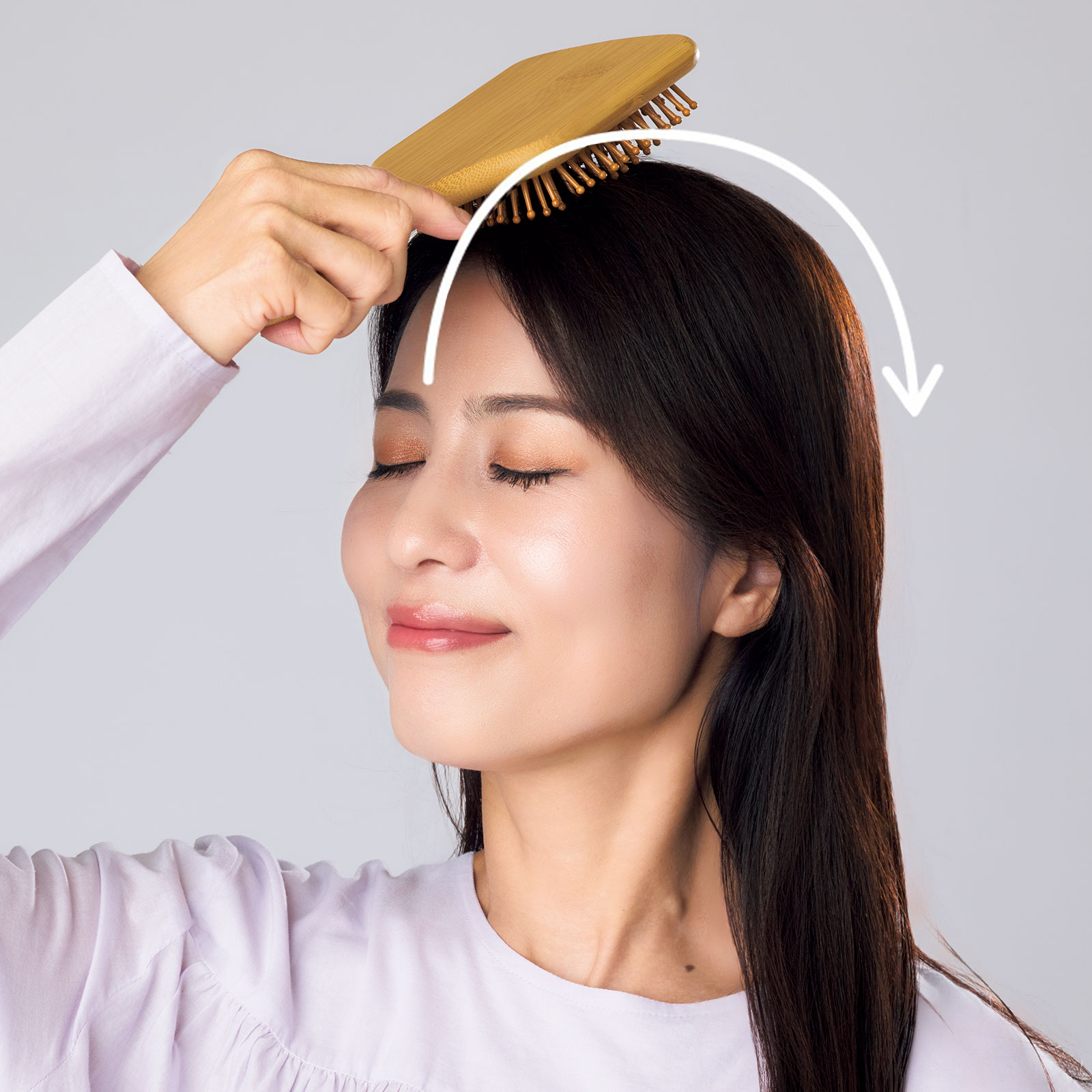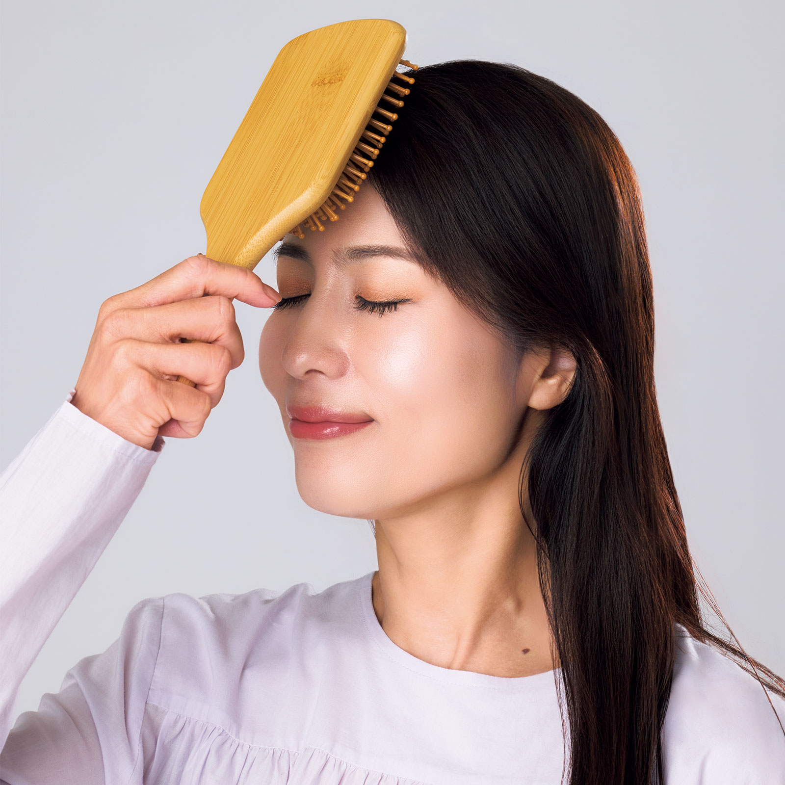 肩より上の頭のツボは108カ所と言われ、頭を触ればツボに当たるというくらい密集しています。しかも脳疲労に効く8大ツボは頭の真ん中の正中線上に並んでいます。頭皮は薄いので頭のツボへの刺激はやさしく触れるくらいで十分。クッション性の高いパドルブラシを使うとピン先が頭皮に沿って均一な力で筋肉やツボに刺激を与えられます。朝は交感神経を優位にしてシャキッとしたいのでテンポをやや速めに、夜は副交感神経を優位にしたいのでブラシをゆっくり動かしてみてください。