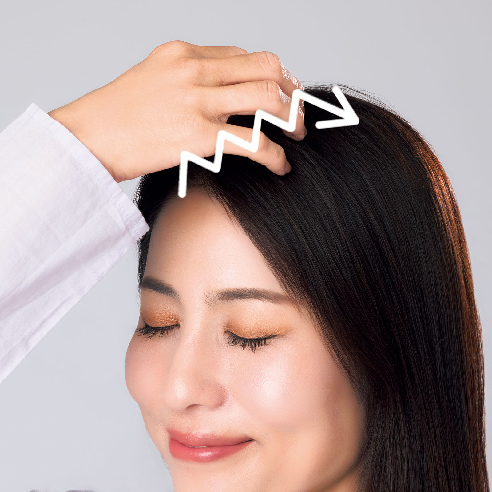 ブラシのプロセスと同様に、5本指を頭皮に当てたら中指が正中線を伝うように指をジグザグ揺らしながら後ろに向かって動かします。