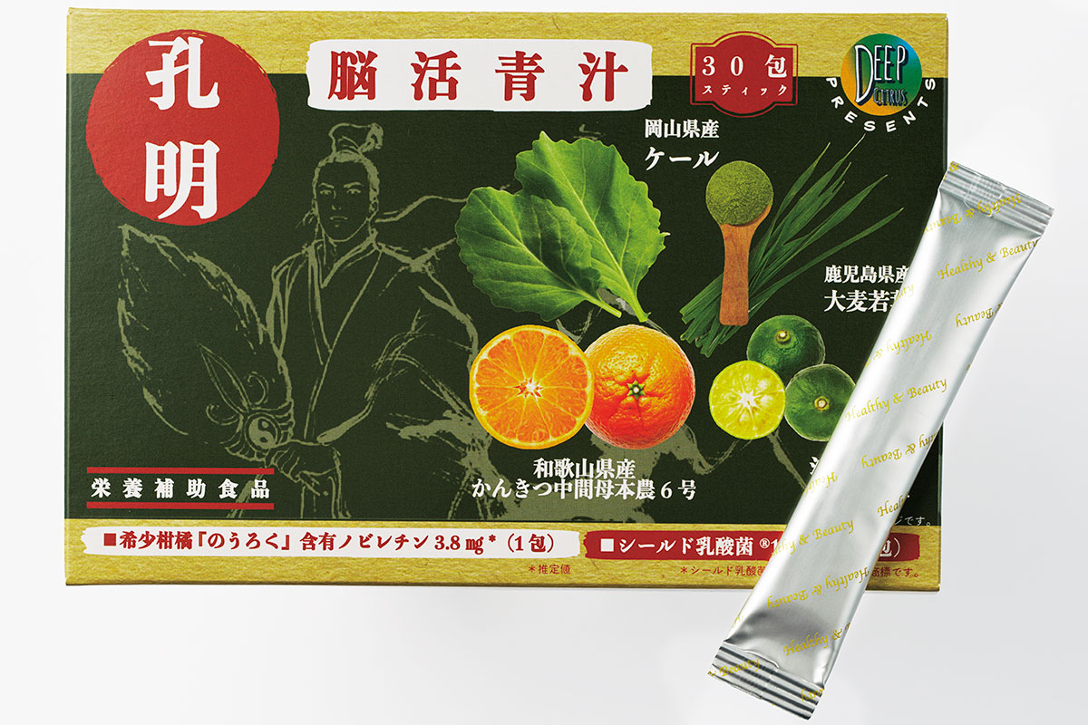 柑橘類に含まれるフラボノイドの一種であるノビレチンが、認知症をはじめとした脳活の効果に期待!腸内環境を整えながら脳に嬉しい成分を配合した次世代型青汁。 脳活青汁 孔明 30袋入り ¥4,680 (DEEP CITRUS)