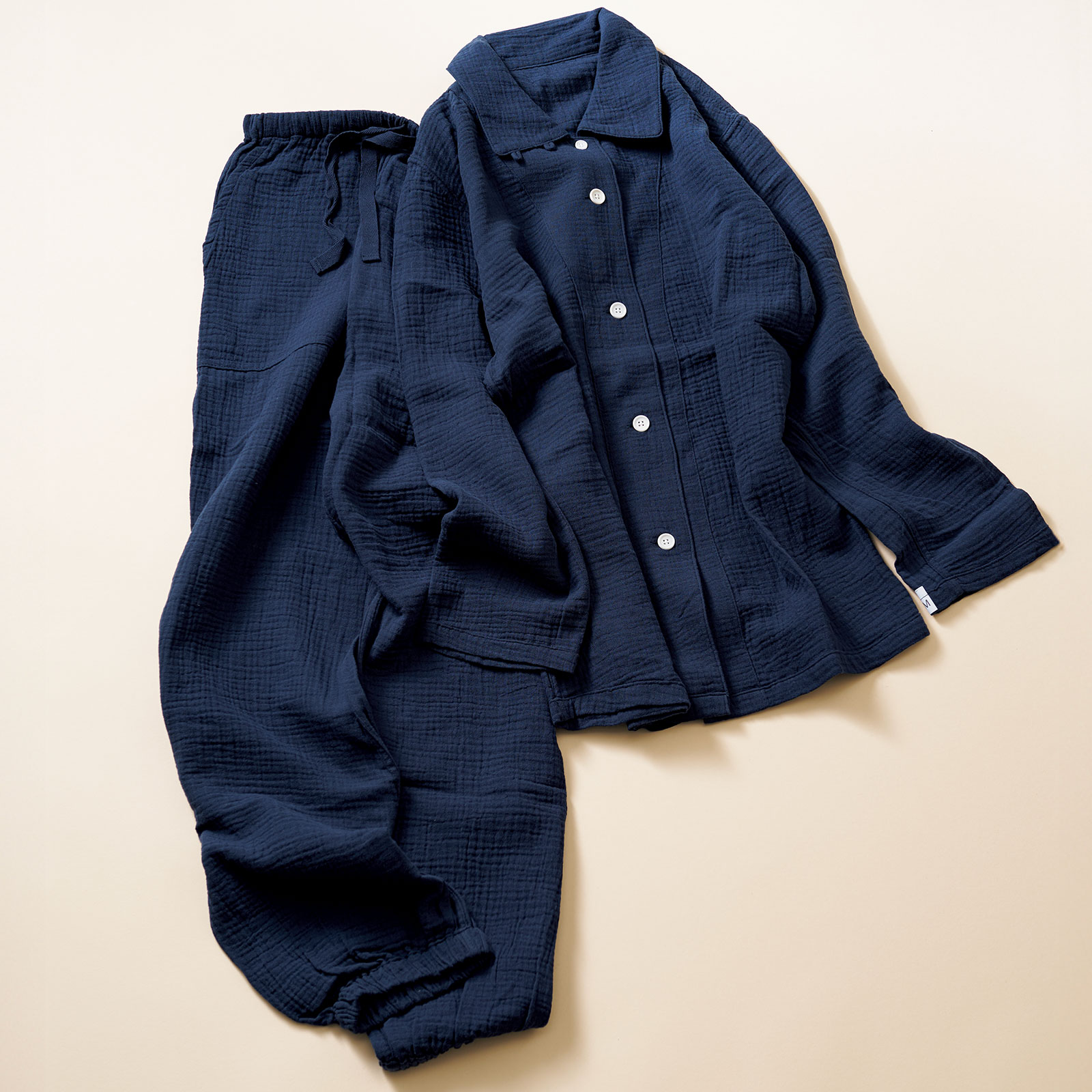 睡眠環境のサポートに徹底的にこだわったリカバリーウェア。深い睡眠に必須とされる深部体温と皮膚体温の温度差を縮める素材と構造にこだわり、副交感神経の優位を促して体も脳も休まる上質な睡眠を可能に。マリネス ネムリカパジャマ ¥23,800 (mariness)