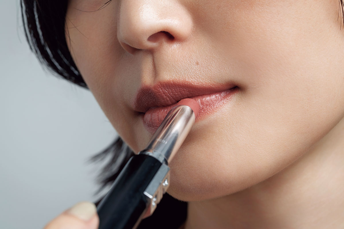 唇の形通りに直塗りしたら、スティックの先端を使って輪郭を整えます。マットなテクスチャーながら、なめらかな質感が新感覚。薄膜でふんわり溶け込むようにスルスルと唇に馴染み、抜け感のある上品な仕上がりが叶います。