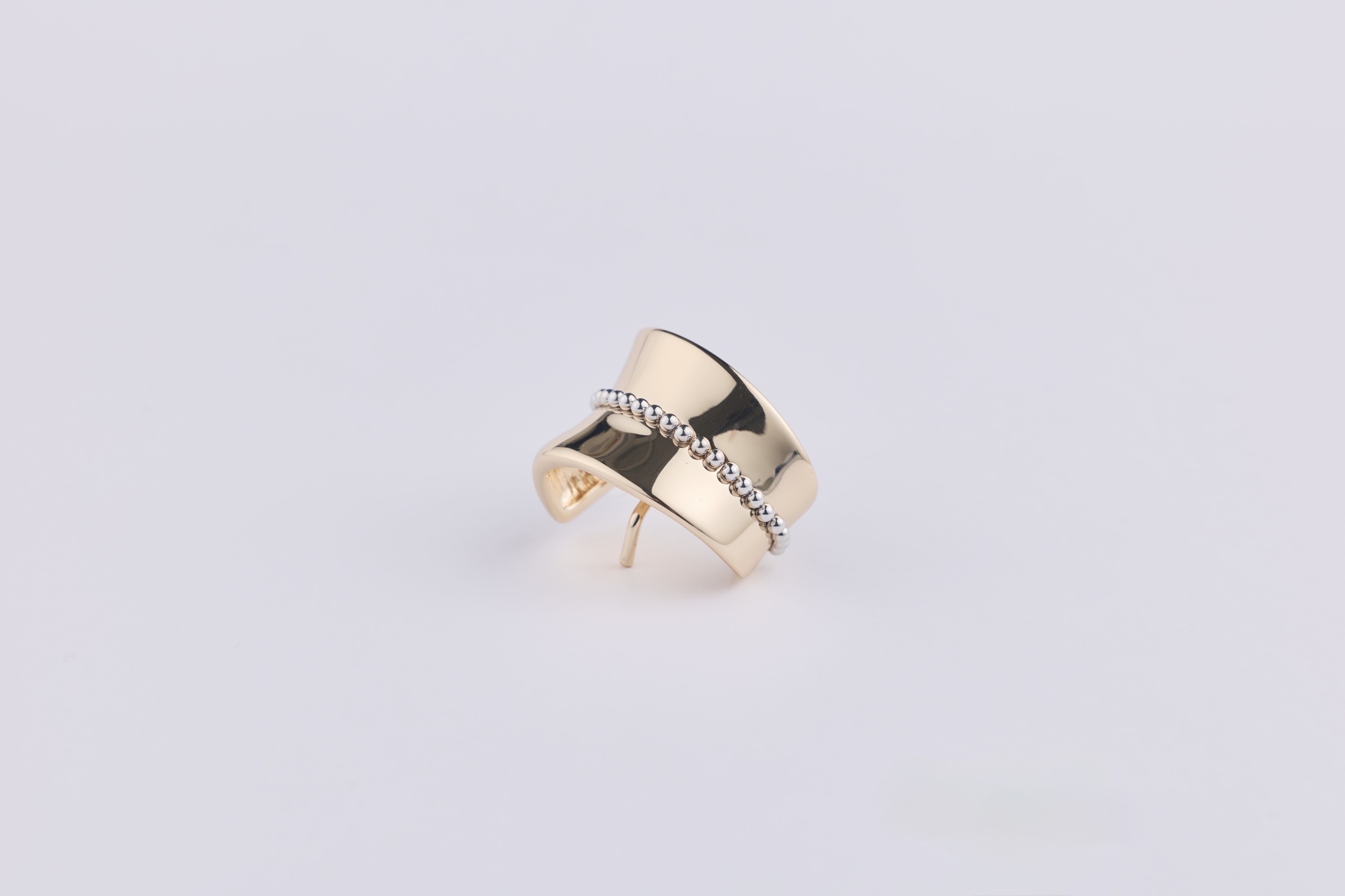 量のある毛束もしっかりとホールドしてくれる太目のヘアカフ。ゴールド×シルバーヘアカフ¥1,100(OSEWAYA/お世話や)