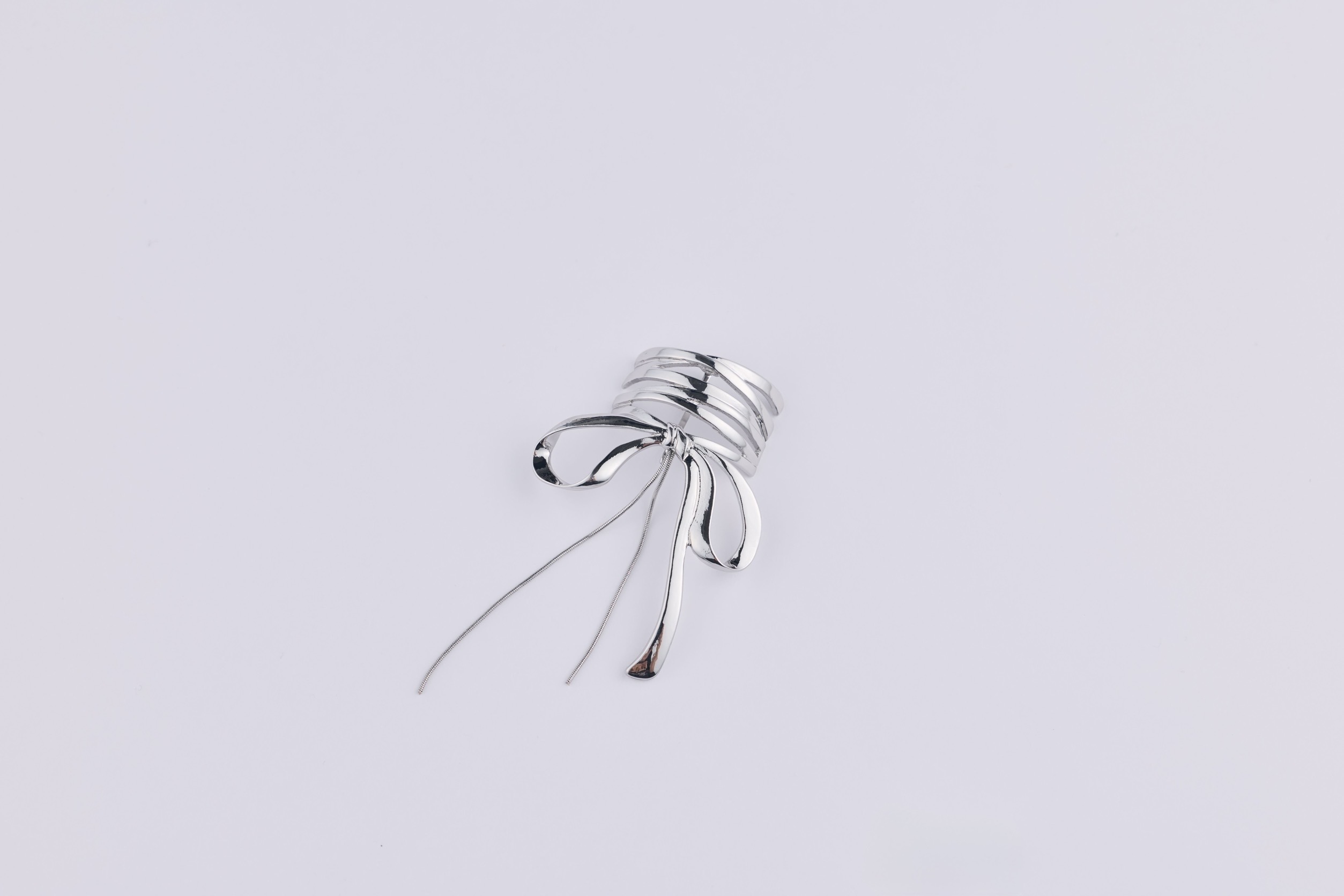 下に垂れるデザインのリボンモチーフが、毛束をスッキリ見せてくれます。シルバーリボンヘアカフ¥1,980(dee doo dah/アジュールスカイ)