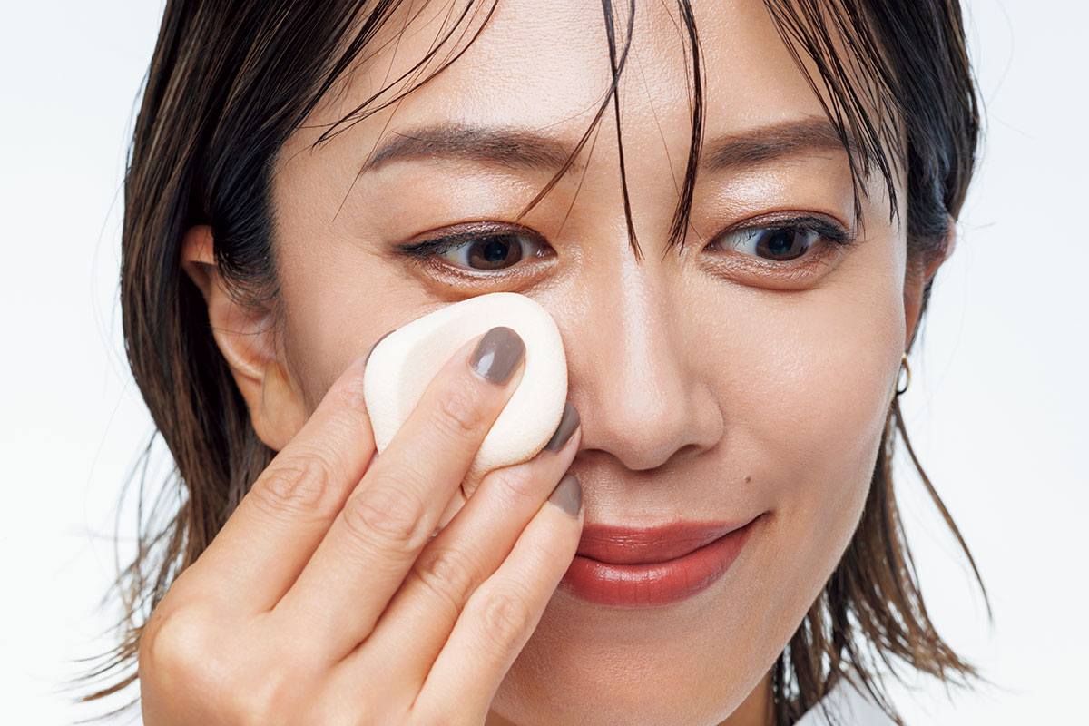 スポンジの半分に取り、均一に広げます。もし厚塗り感が気になるなら、スポンジのコーナーに取って一度手の甲で馴染ませて調節。最もカバーしたい目の下から、放射線状に広げます。