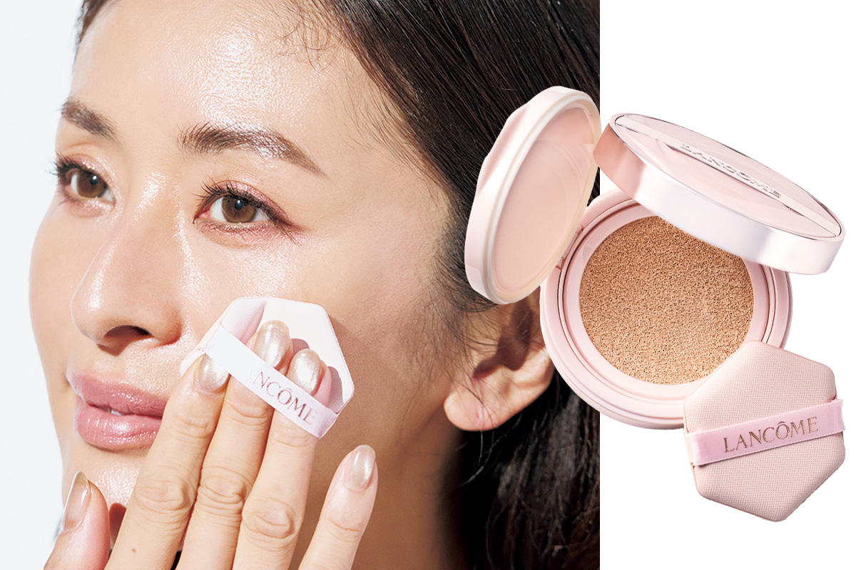 手軽にツヤ出しできるクッションファンデ。平たい顔にならず軽やかに仕上げるには、顔中心からのせて、外側は薄く。イドル スキン セラム ファインカバー クッション P10 ¥7,920(ランコム)