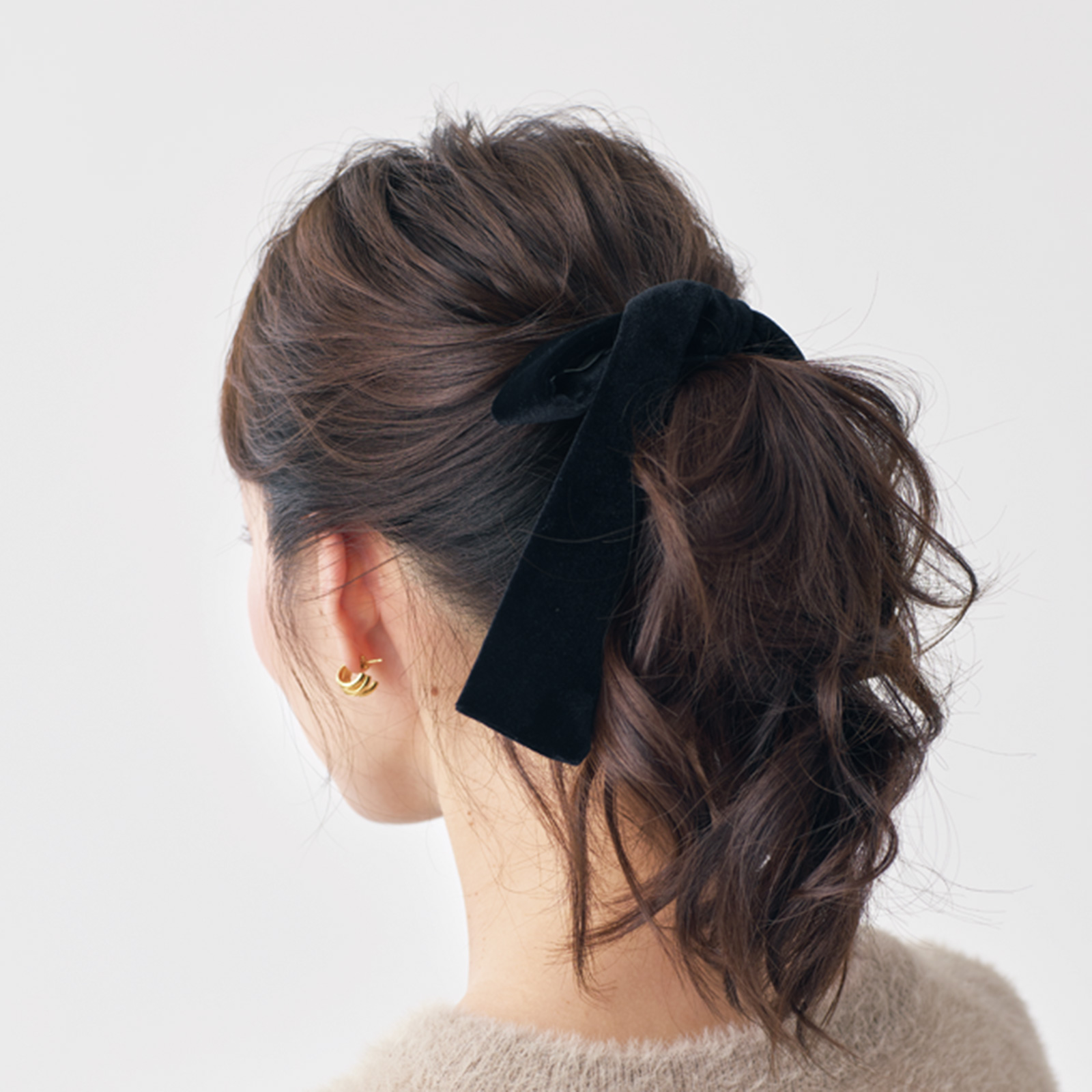 トップをふんわり仕上げるには、髪を引き出して高さを出すのが正解。そのためにはゴムできつめに結んでしっかりした土台を作ることが大切です。華やかさを加えてくれるリボン付きゴムを使って耳上の高めの位置でポニーテールにしたら、トップの髪を指先でつまんで細かく引き出せば簡単にふんわりします。