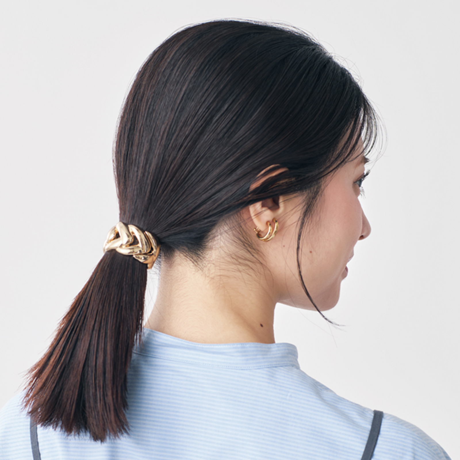 全体がボワッと広がるうねりをカバーするには、オイルをまんべんなくつけてからテンションがかかるようにキュッとひとつにまとめて低めで結ぶのが正解。結んだ根元には幅のあるヘアカフスをつけると、広がりが隠せるだけでなく縦ラインが強調されてスリムな印象に。