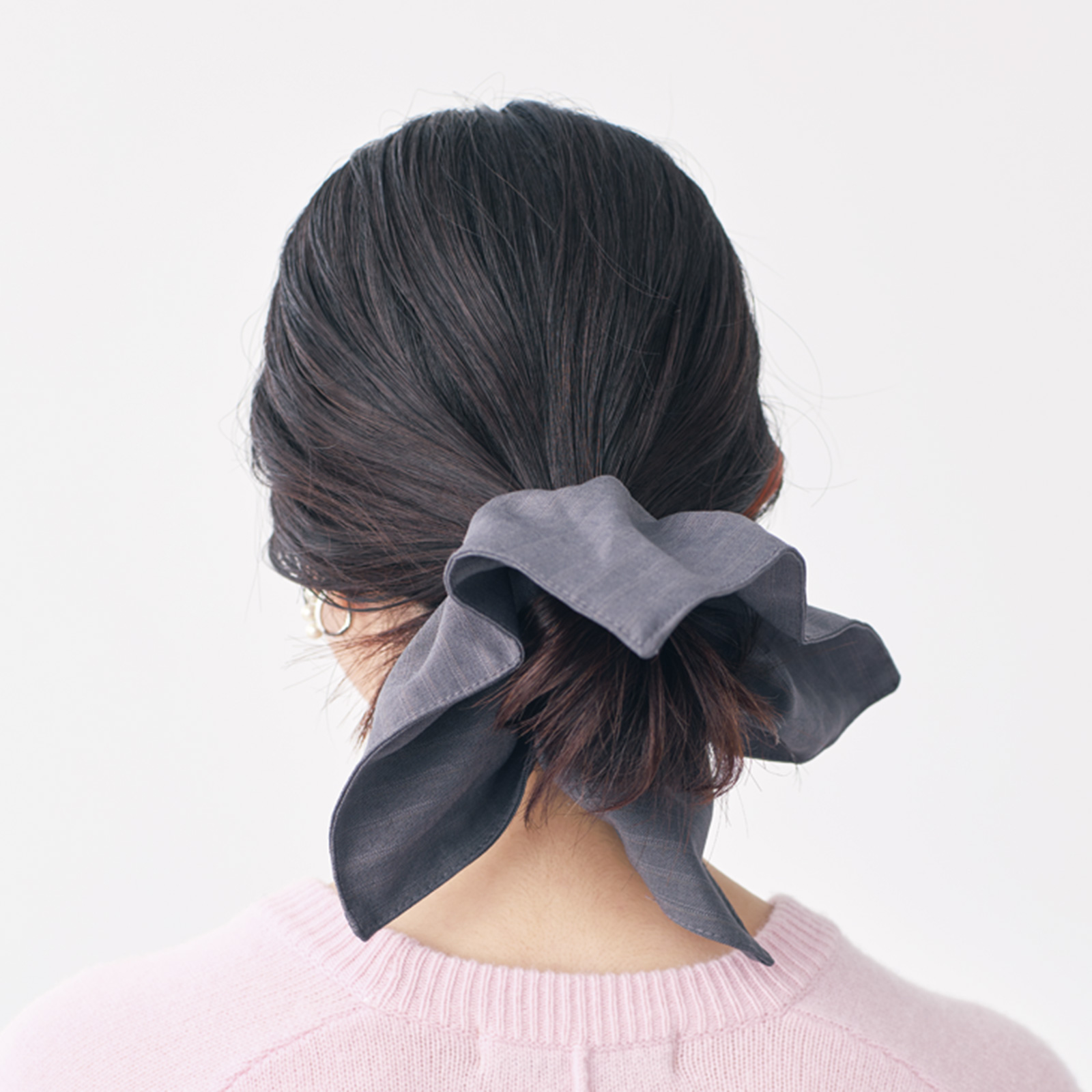 大振りですがクタッとなじむので頭でっかちに見えません。スクエアシュシュ¥1,980(アネモネ/サンポークリエイト)