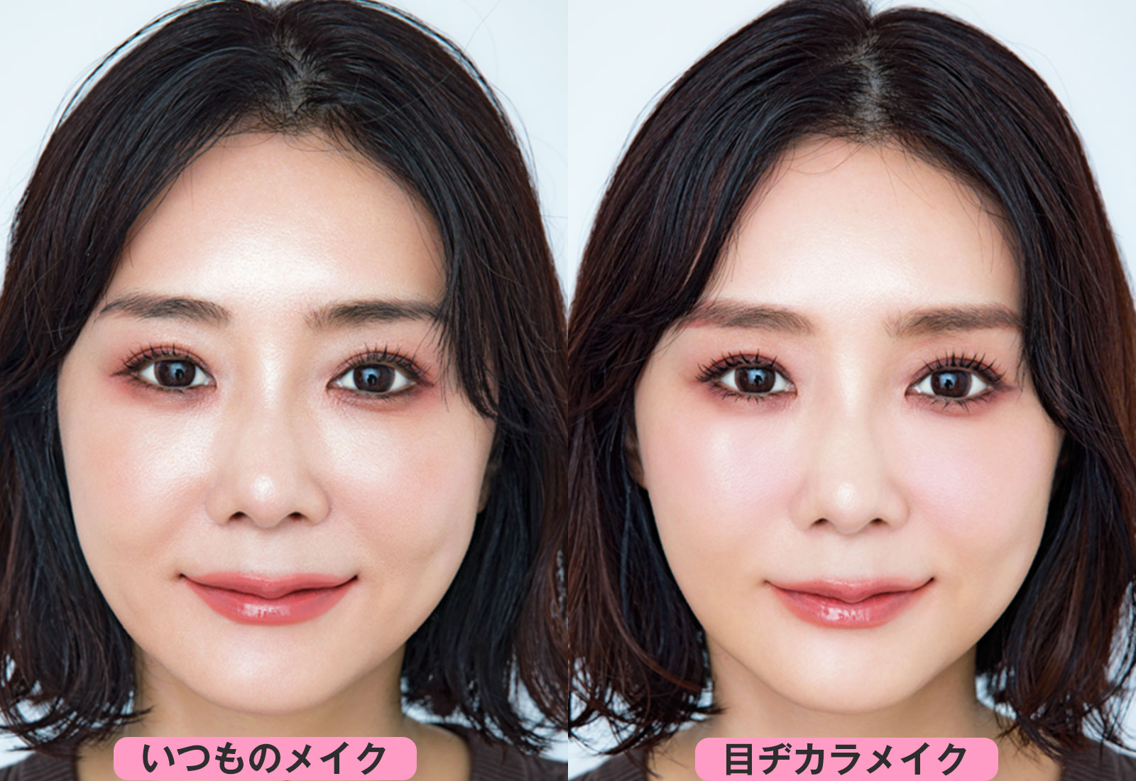 いつもメイクでも手持ちのピンク系パレットでメイクを。色味も目ヂカラで使ったものと似ていますが、入れ方次第で目元の立体感が激変! まつ毛を束にすることで目元の吸引力もアップしました。