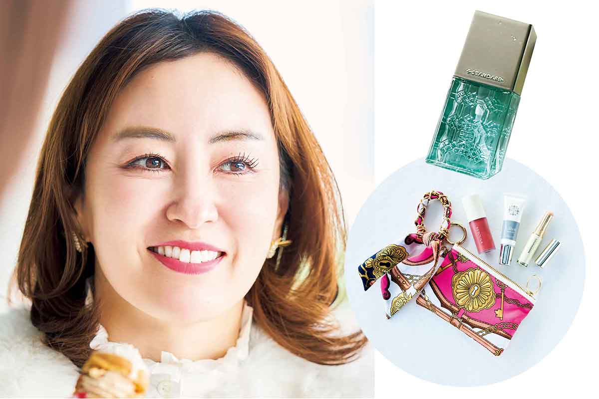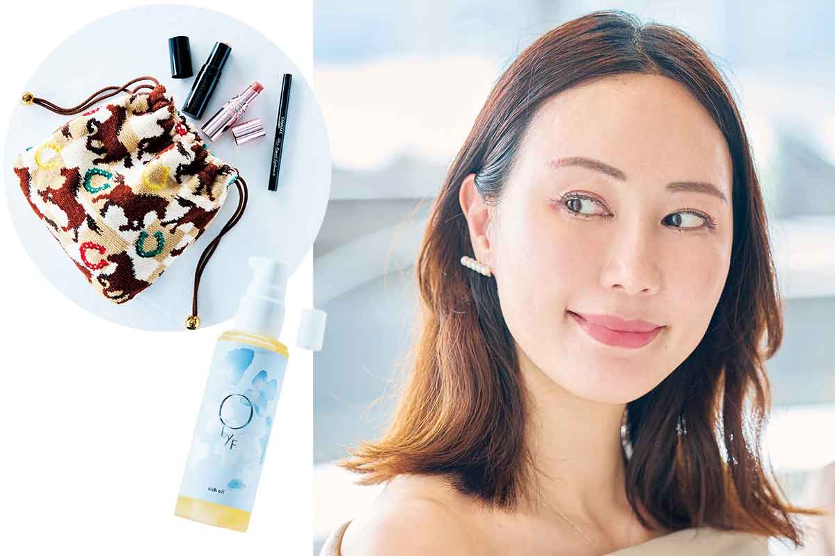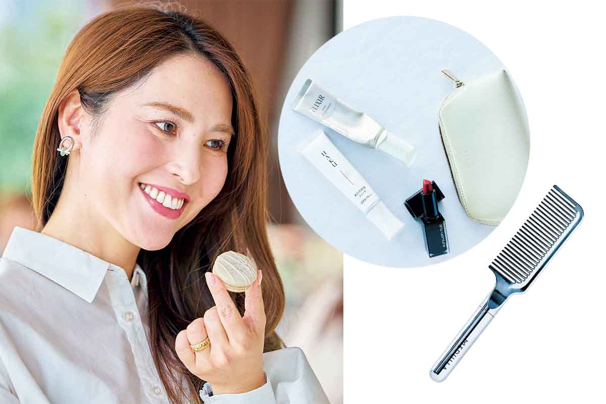 ピラティスのレッスン後に女子会に参加することが多いので、さっと梳かすだけでボリュームロングヘアを瞬時に整えてくれるコームが必需品です。シミもムラもカバーするHAKUの美白美容液ファンデは本当に優秀。リップはシュウ ウエムラのキヌサテン188を。深みレッドで、顔色をパッと明るく、華やかな印象にしてくれるので重宝しています。